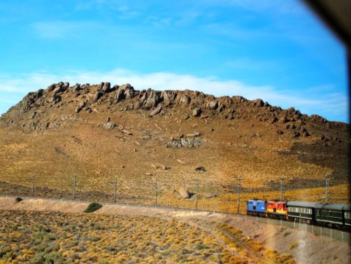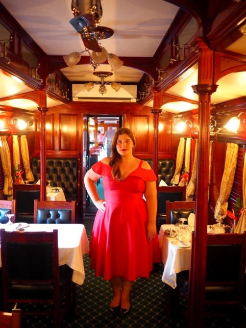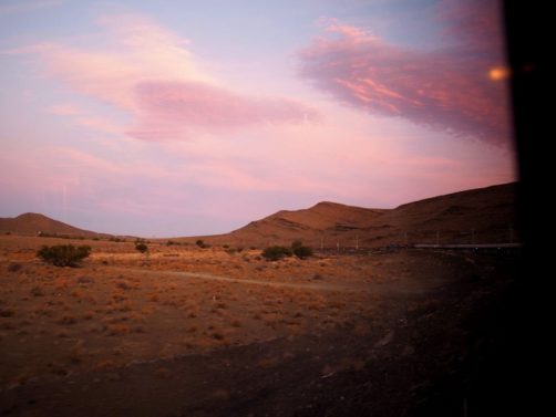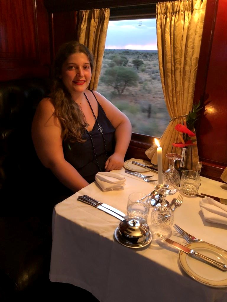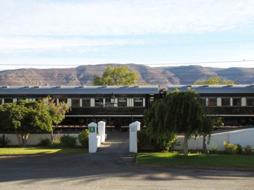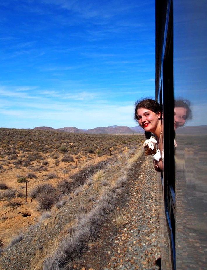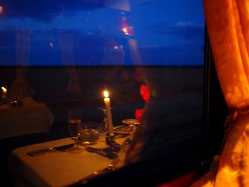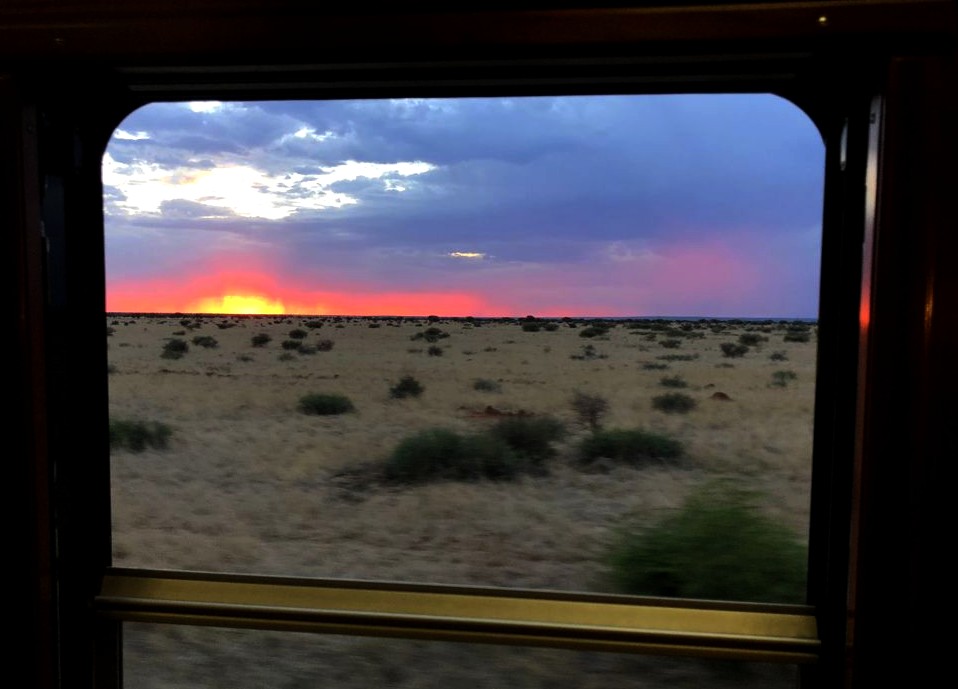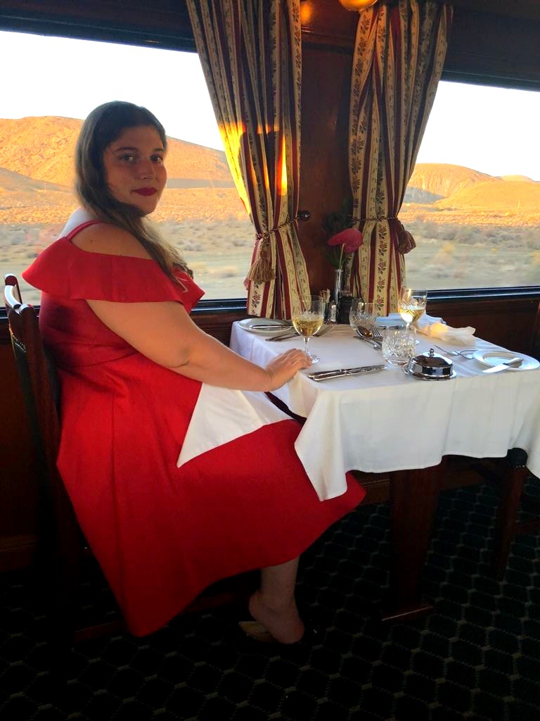 19h. C’est l’heure de dire au revoir à Matjiesfontein et de se préparer pour le repas du soir ! Dress code oblige, je revêtis une robe au style un peu rétro, avant d’aller admirer les vues sur le désert du Karoo depuis le wagon restaurant, entre pleines désertiques et montagnes arides.