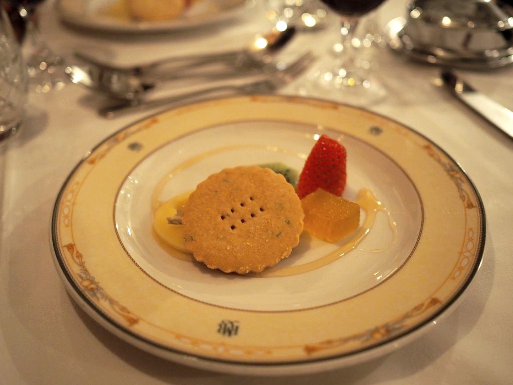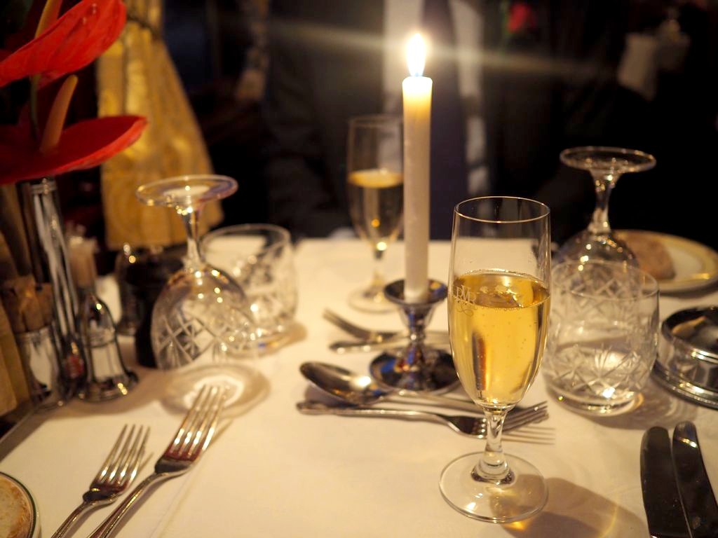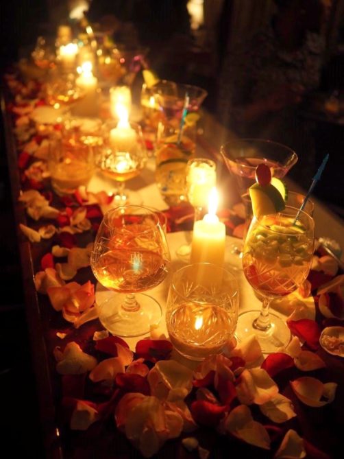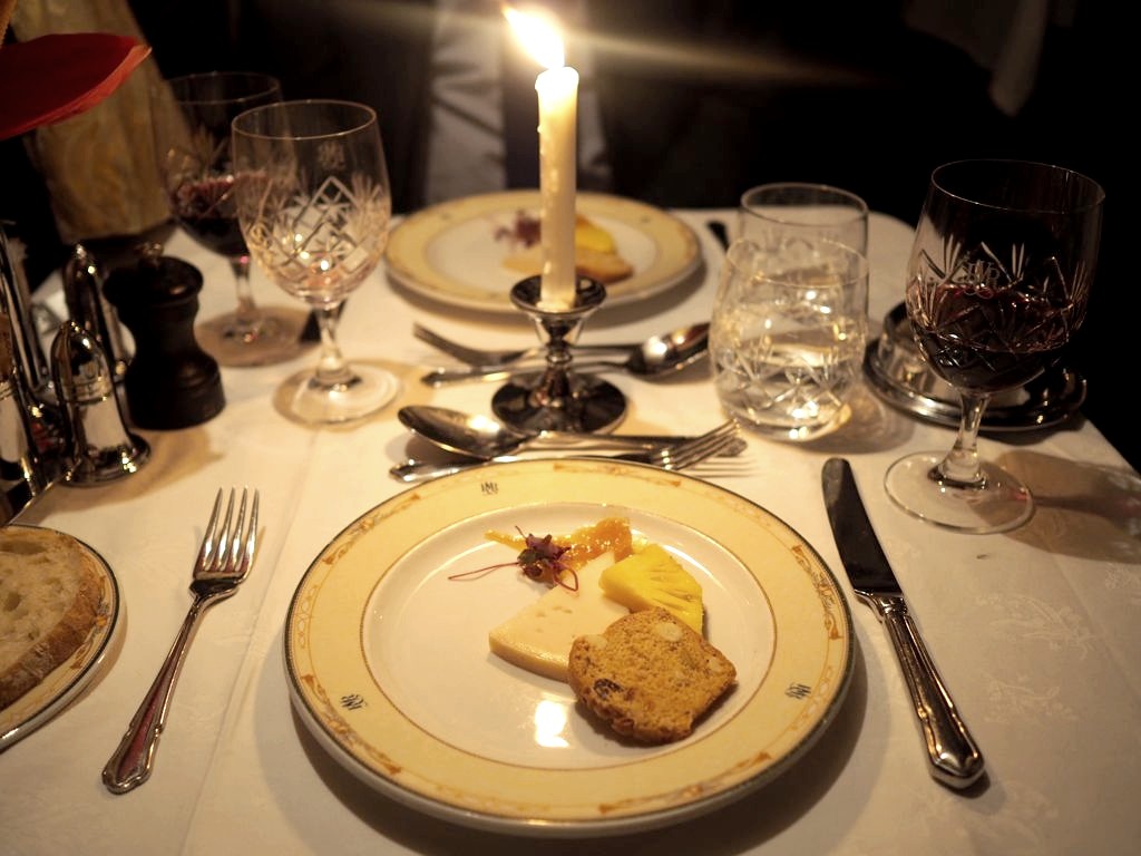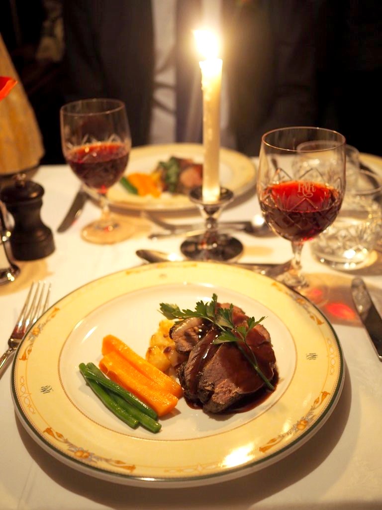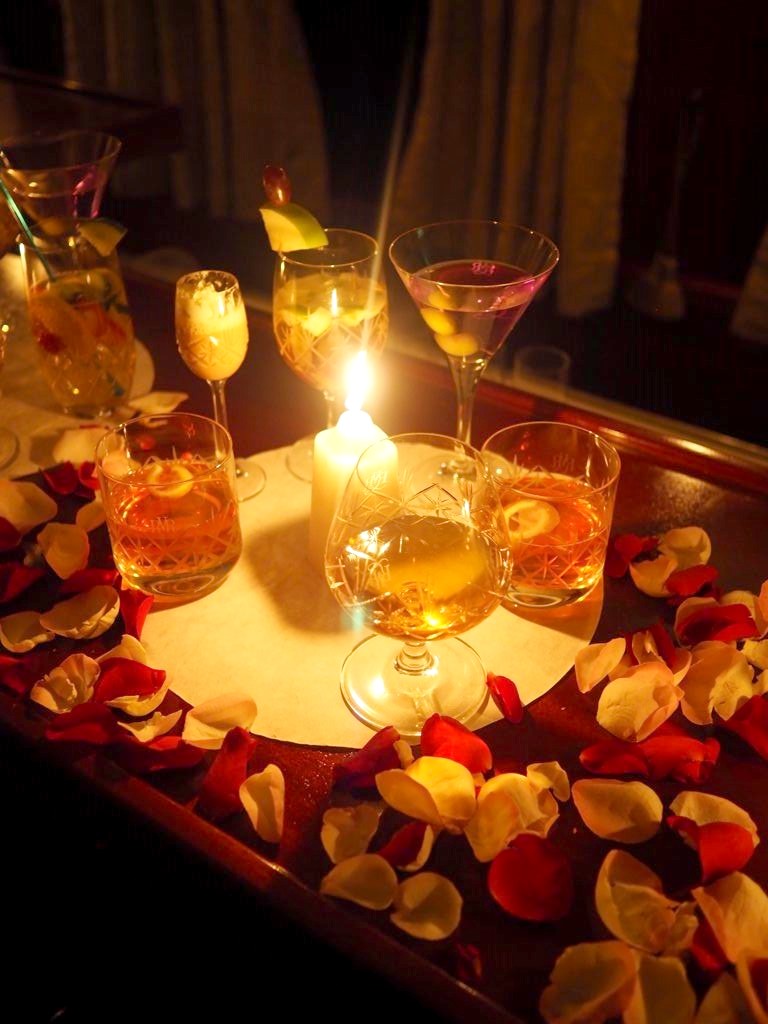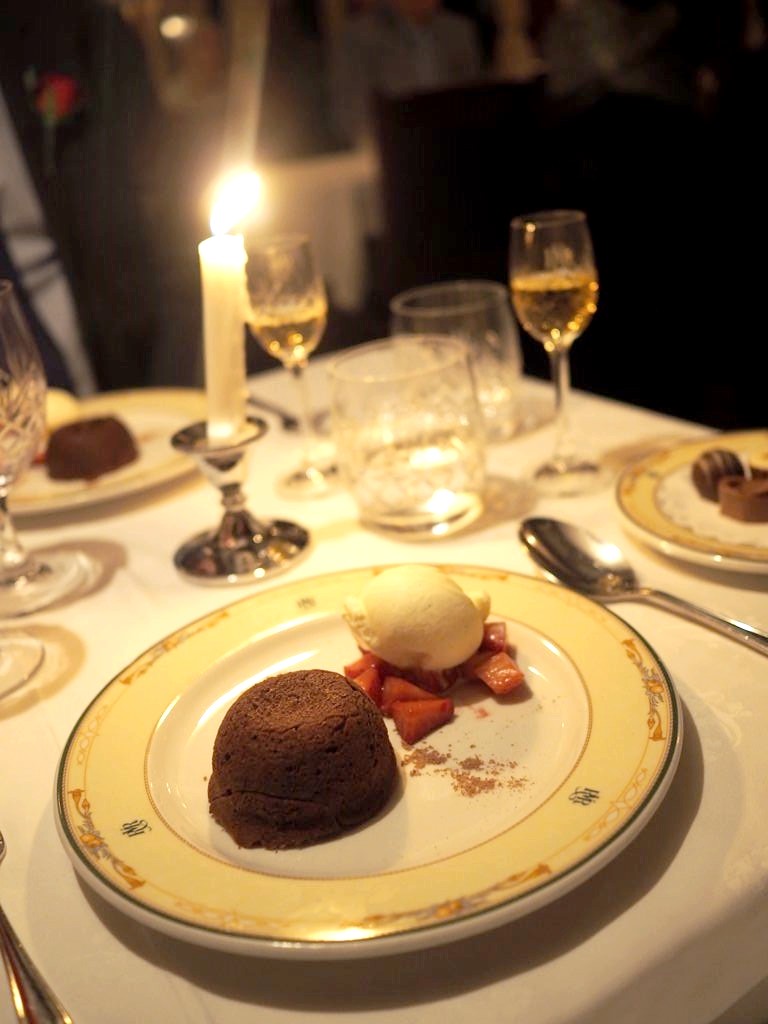 19h30. Pour ce deuxième (et déjà dernier) repas du soir, le dress code est à nouveau de rigueur, mais aujourd’hui c’est encore plus chic ! Les serveurs ont changé de costumes, des bougies ont été allumées partout, et nous recevons chacun une rose à porter (rouges pour les messieurs, roses pour les dames).
