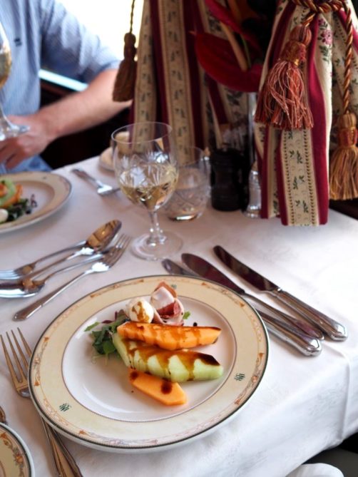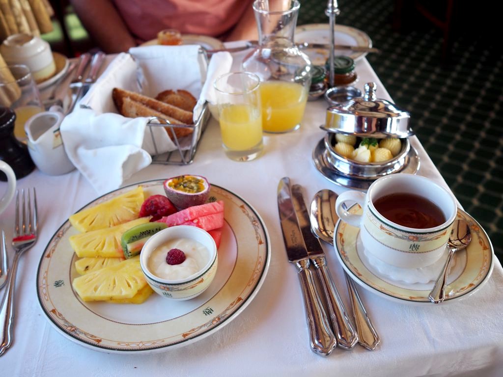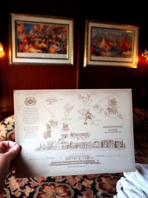 Je détaillerai les repas dans le carnet de bord ci-dessous mais j’ai apprécié le fait que tout est fait ici aussi pour reproduire les conditions de l’époque à laquelle la décoration fait référence : les assiettes sont classiques et auraient très bien pu être servies à l’époque (ne vous attendez pas à trouver de la cuisine moléculaire ici !). L’équipe essaie au maximum d’utiliser des ingrédients locaux et de proposer des plats traditionnels (ce qui veut donc dire, en Afrique du Sud : pas mal de viande).