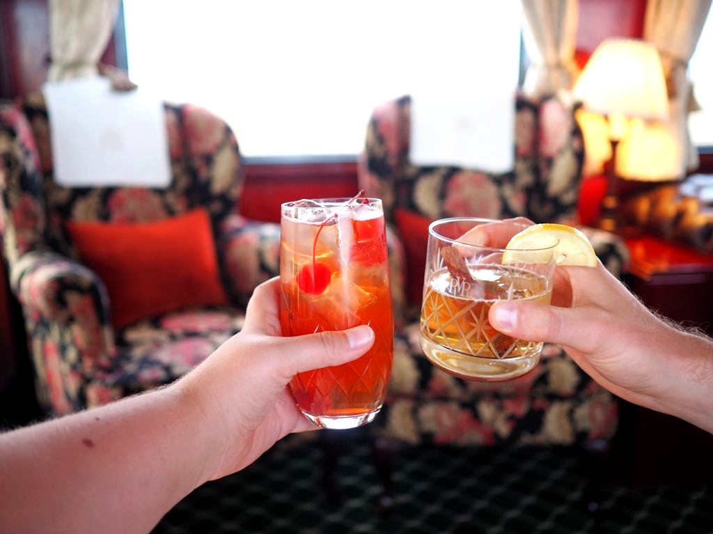 Du dernier au premier wagon, notre train était organisé comme suit : wagon d’observation à l’arrière avec le premier bar (Observation Car), smoking lounge, compartiments des voyageurs (première partie), wagon-cuisine, deux wagons-restaurants, deuxième espace bar-lounge, compartiments des voyageurs (deuxième partie), wagons de l’équipage, wagon des générateurs, et enfin la locomotive.