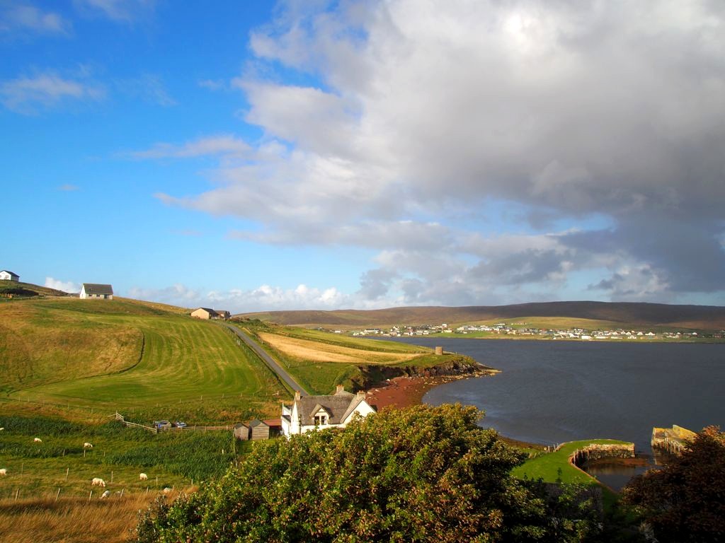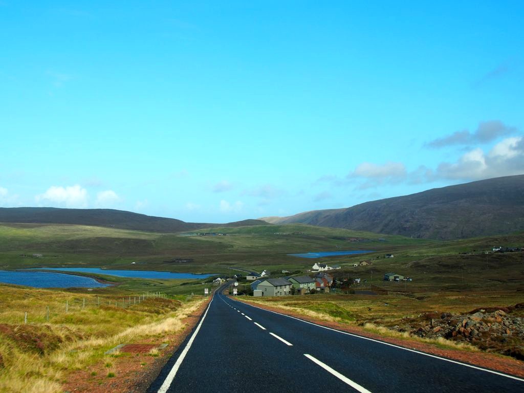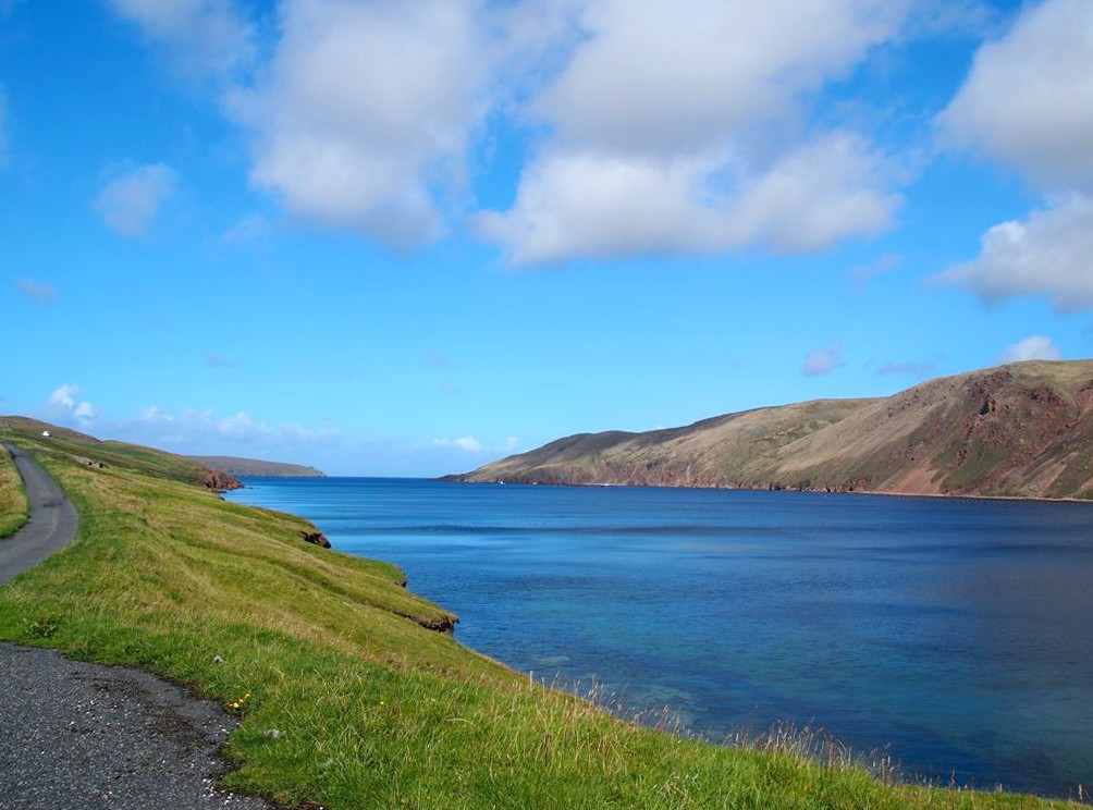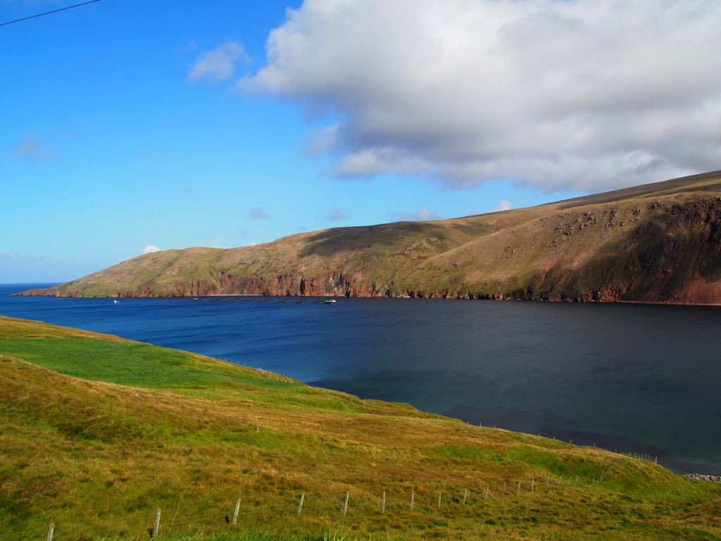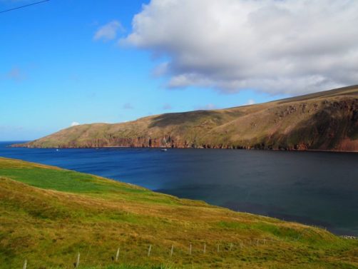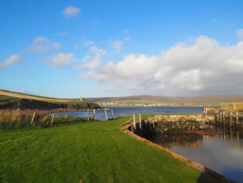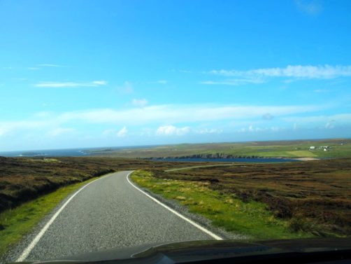 La route pour arriver à notre premier arrêt est, encore une fois, splendide. En traversant la fine bande de terre reliant Northmavine au reste de Mainland, on se trouve entre la Mer du Nord d’un côté et l’Atlantique de l’autre.