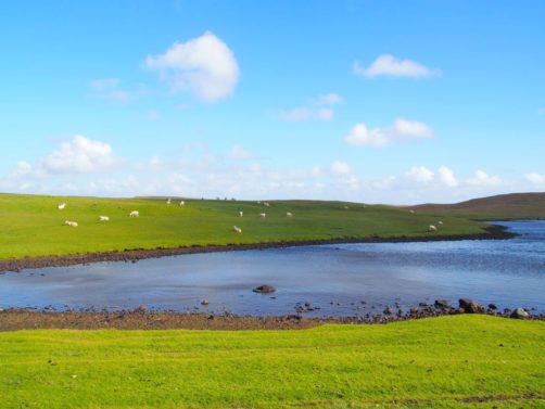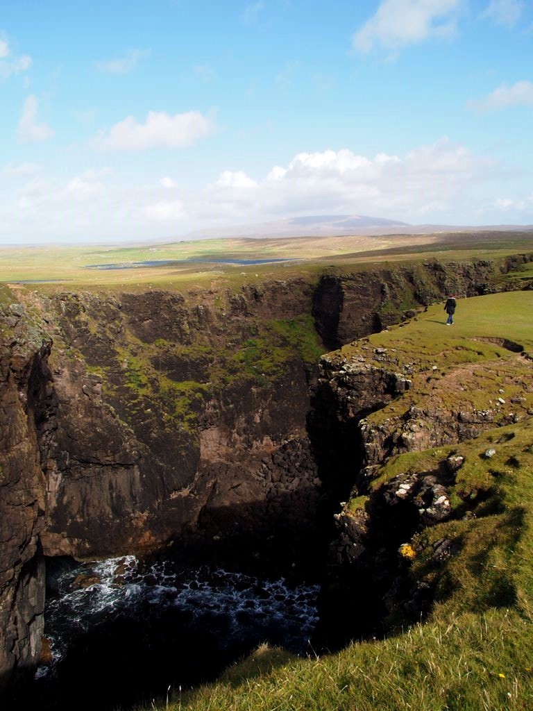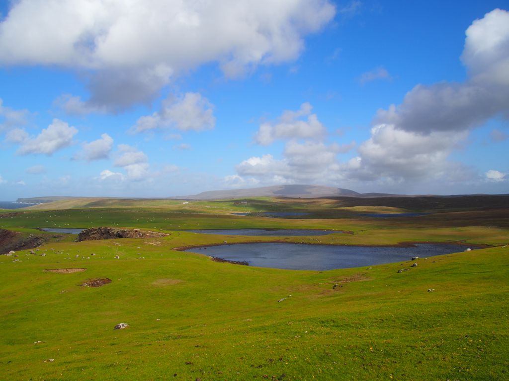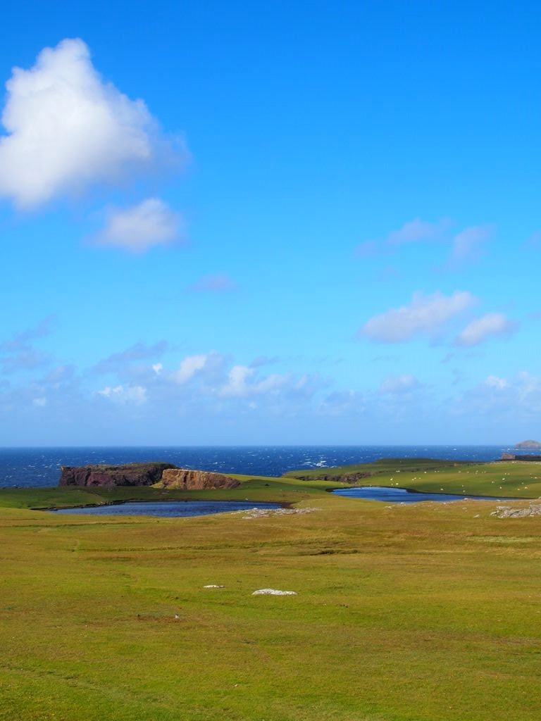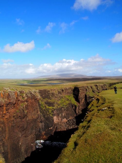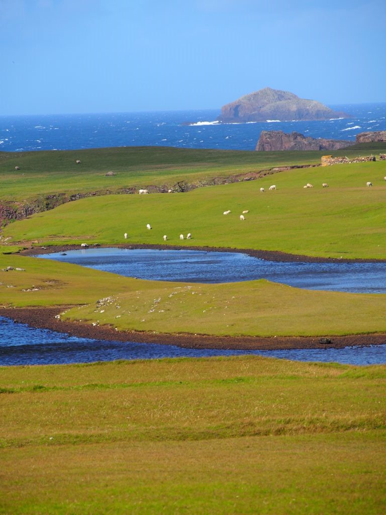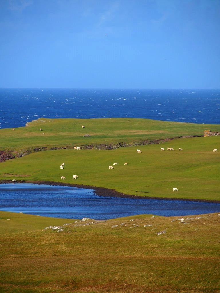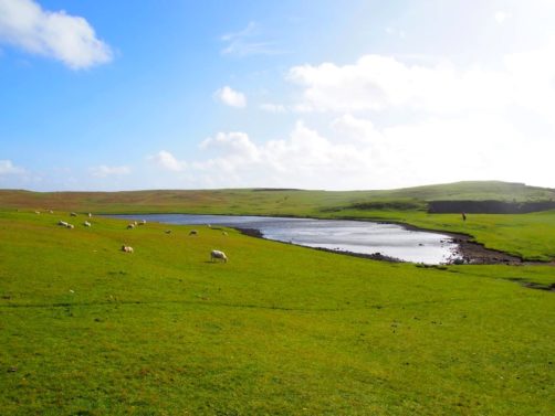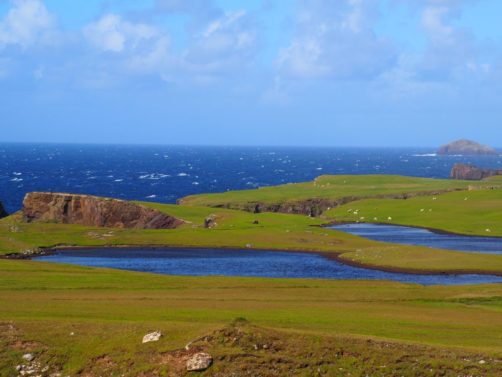 Après avoir contourné un énorme gouffre, on arrive dans une lande d’un vert perçant, où plusieurs lochs font face à l’océan Atlantique déchaîné. Quels paysages incroyables ! C’est vraiment l’un des plus beaux endroits, si pas le plus beau, que j’ai vu aux Shetland.