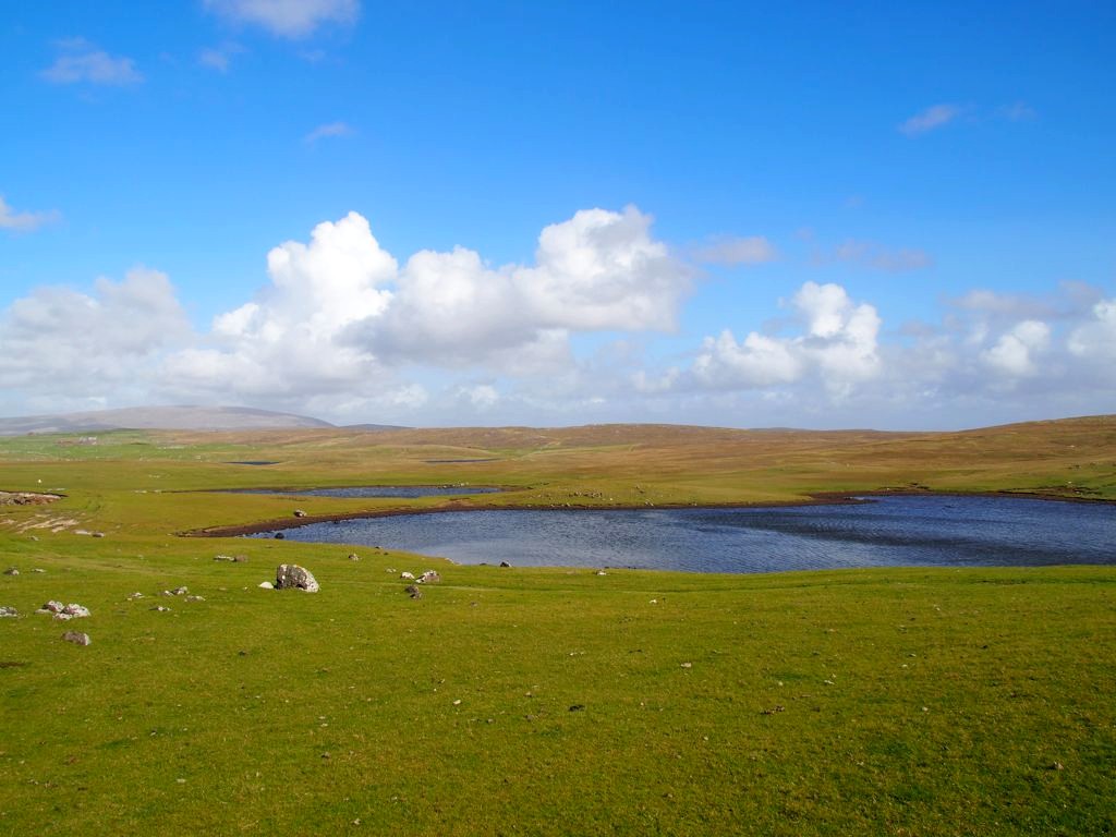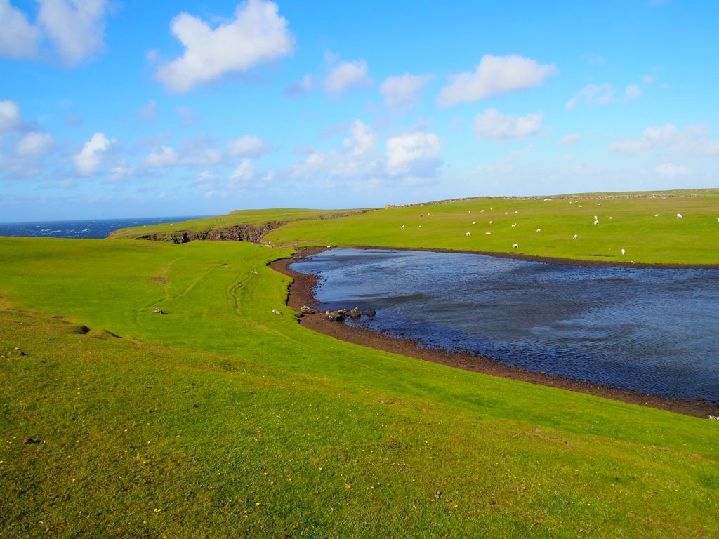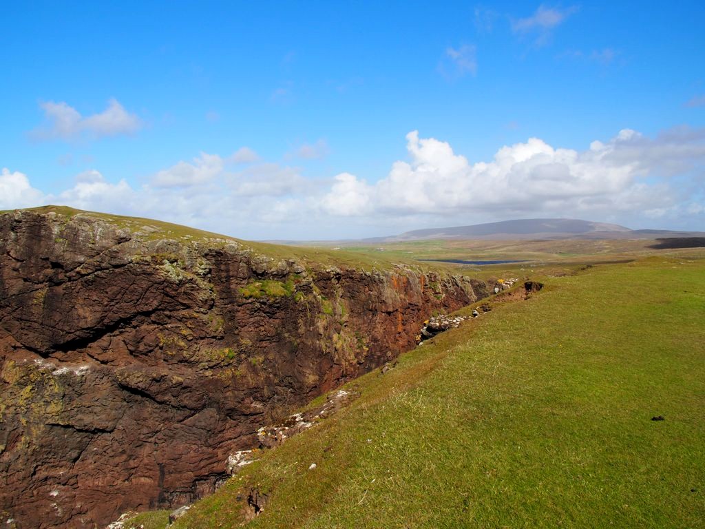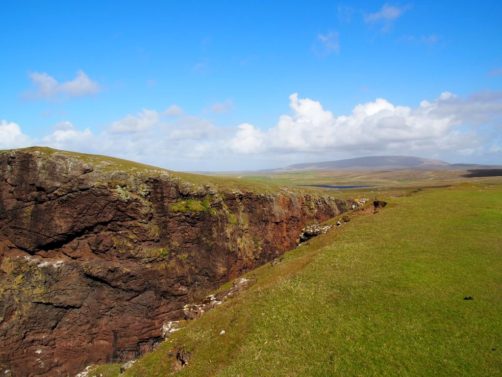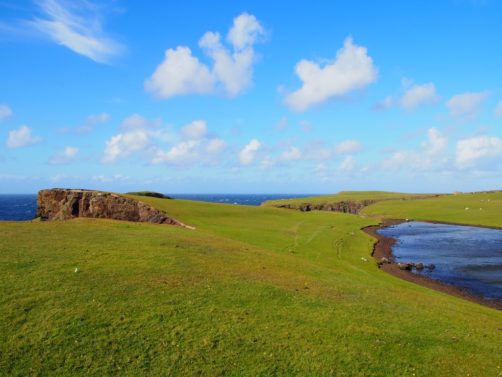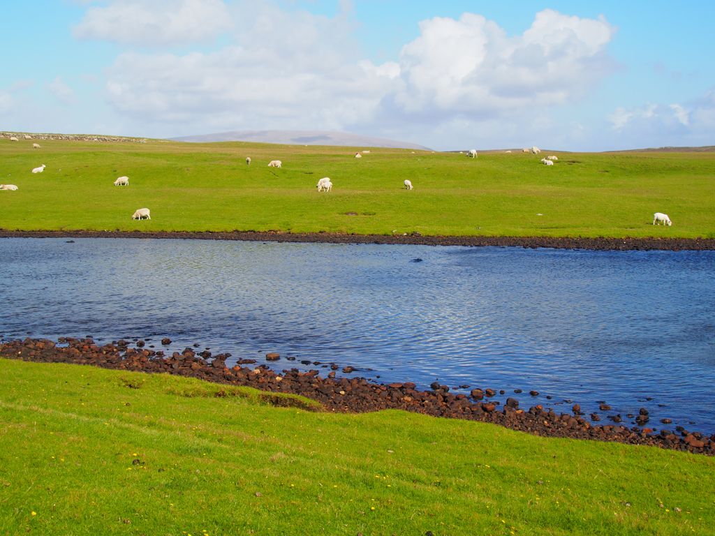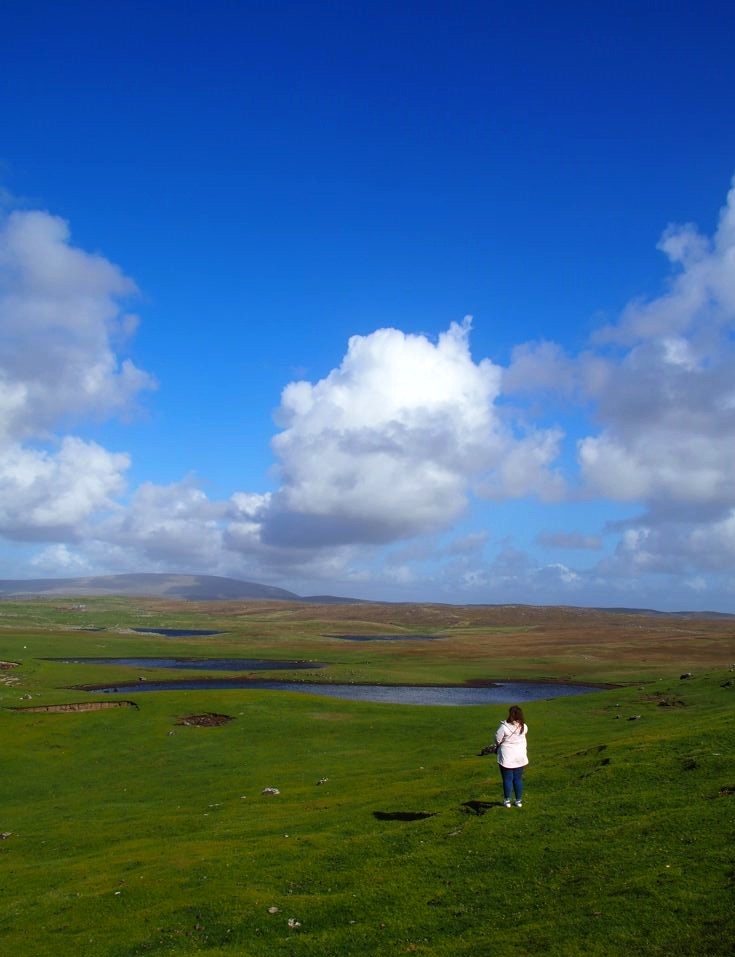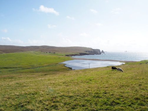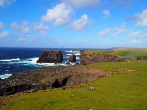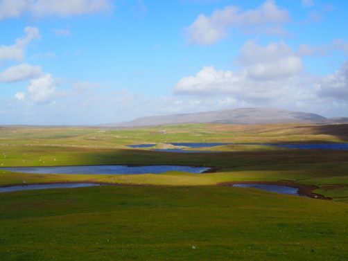 Après avoir contourné un énorme gouffre, on arrive dans une lande d’un vert perçant, où plusieurs lochs font face à l’océan Atlantique déchaîné. Quels paysages incroyables ! C’est vraiment l’un des plus beaux endroits, si pas le plus beau, que j’ai vu aux Shetland.