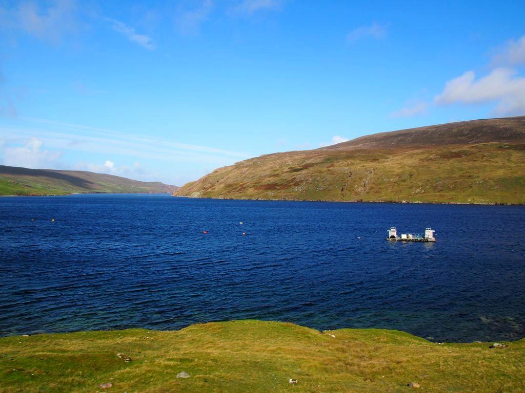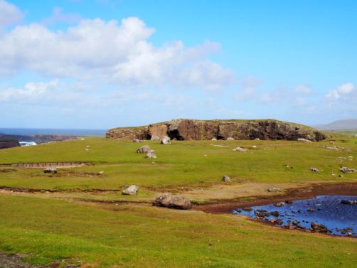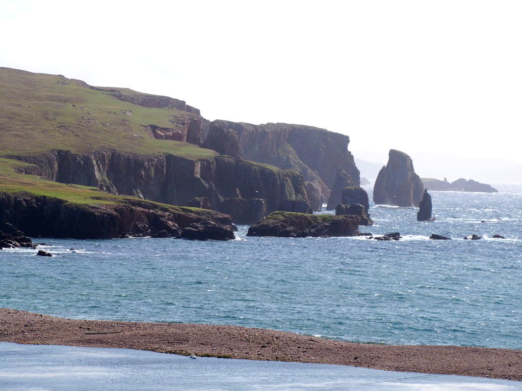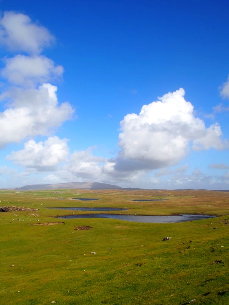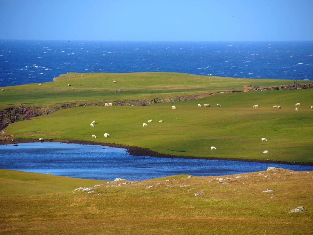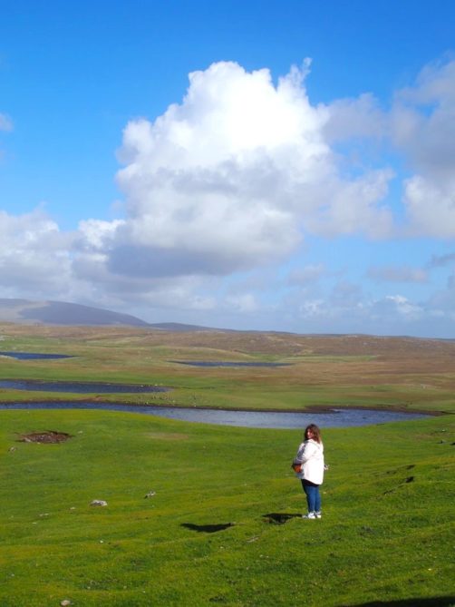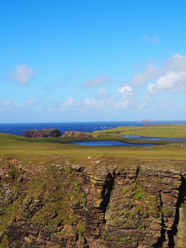 Après avoir contourné un énorme gouffre, on arrive dans une lande d’un vert perçant, où plusieurs lochs font face à l’océan Atlantique déchaîné. Quels paysages incroyables ! C’est vraiment l’un des plus beaux endroits, si pas le plus beau, que j’ai vu aux Shetland.