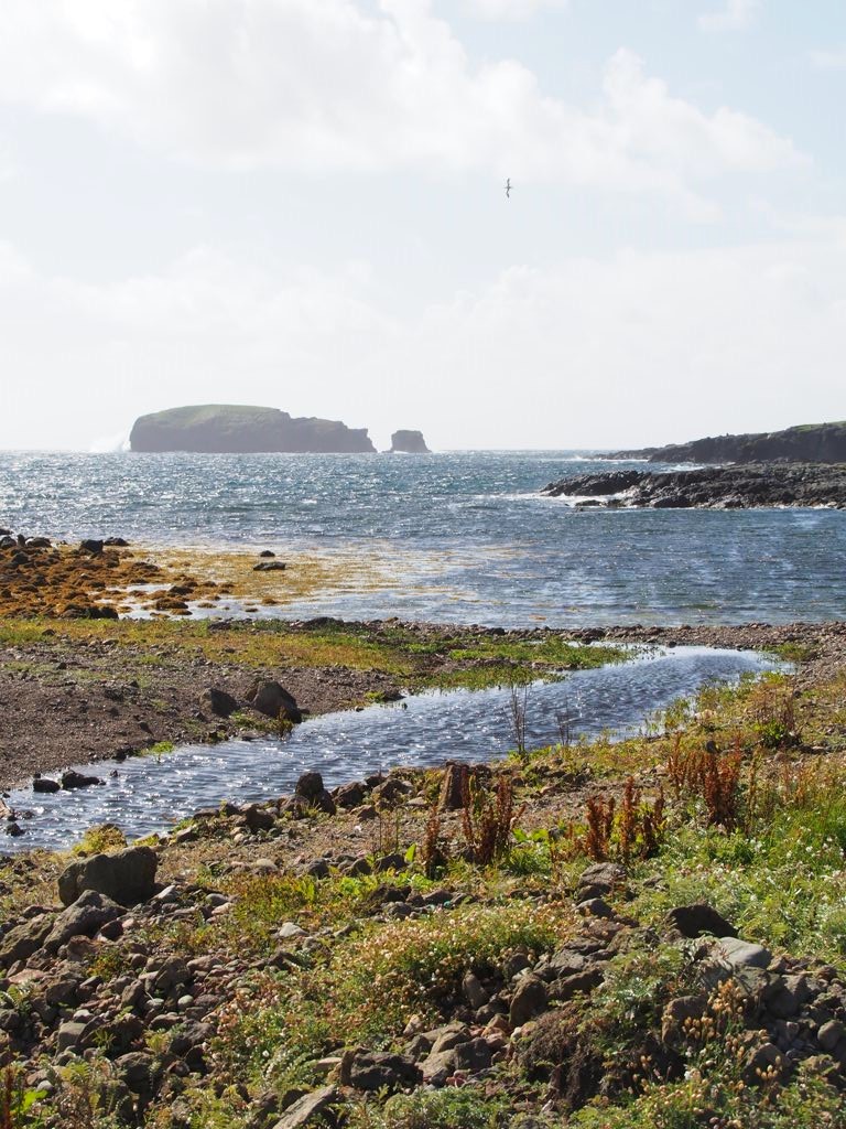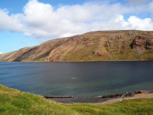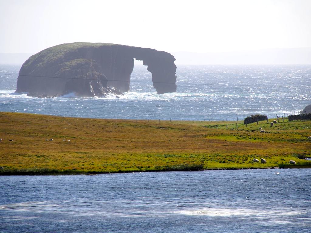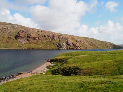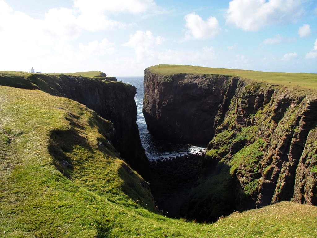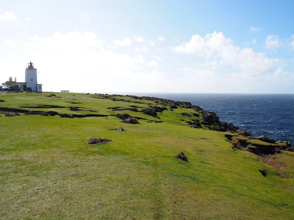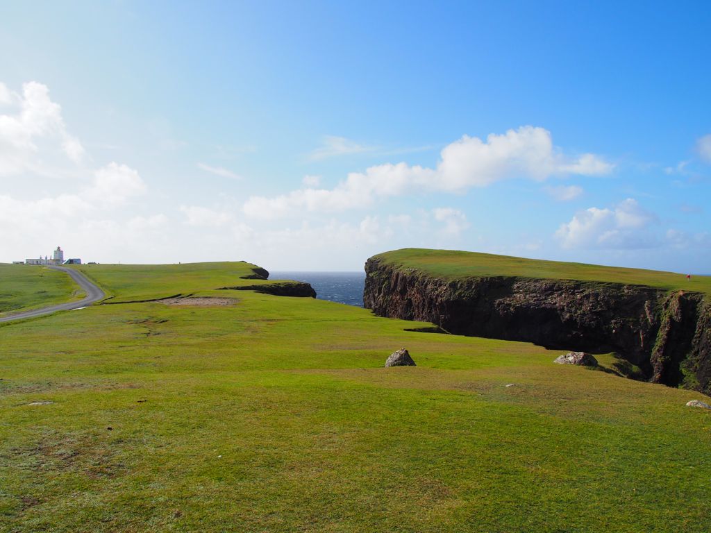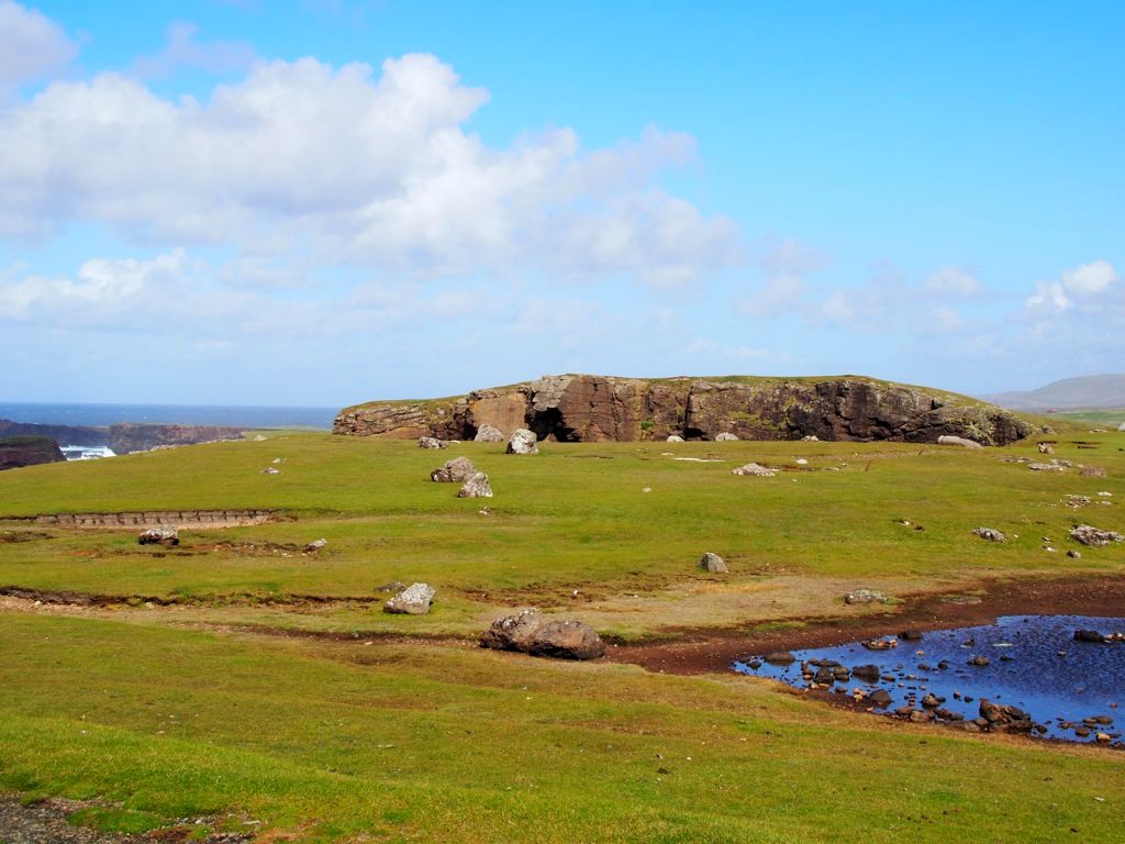 Après avoir contourné un énorme gouffre, on arrive dans une lande d’un vert perçant, où plusieurs lochs font face à l’océan Atlantique déchaîné. Quels paysages incroyables ! C’est vraiment l’un des plus beaux endroits, si pas le plus beau, que j’ai vu aux Shetland.