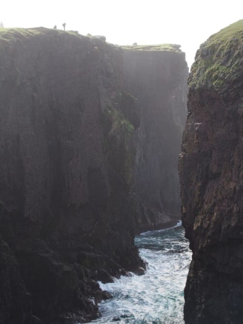 Nous progressons depuis le phare d’Eshaness, longeons les falaises en essayant de ne pas s’envoler à cause du vent ! On nous a dit que certains jours, il était tout simplement impossible de s’approcher des falaises tant le vent était fort… On l’imagine facilement ! Il faut rester très prudent.