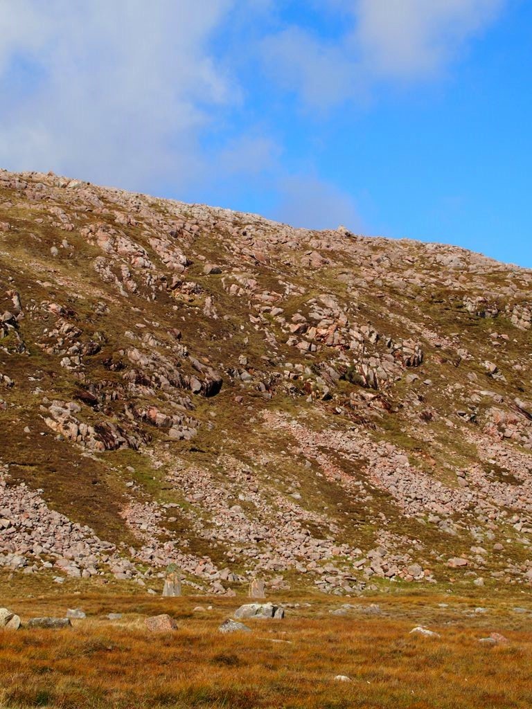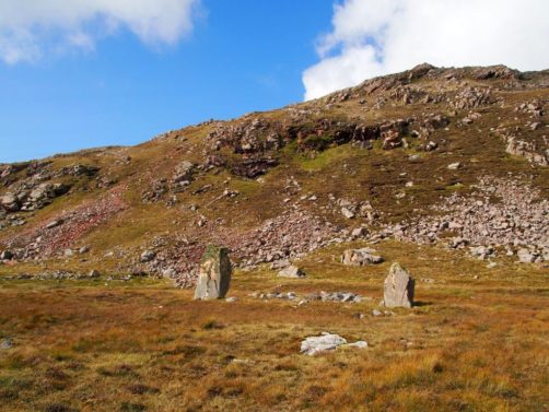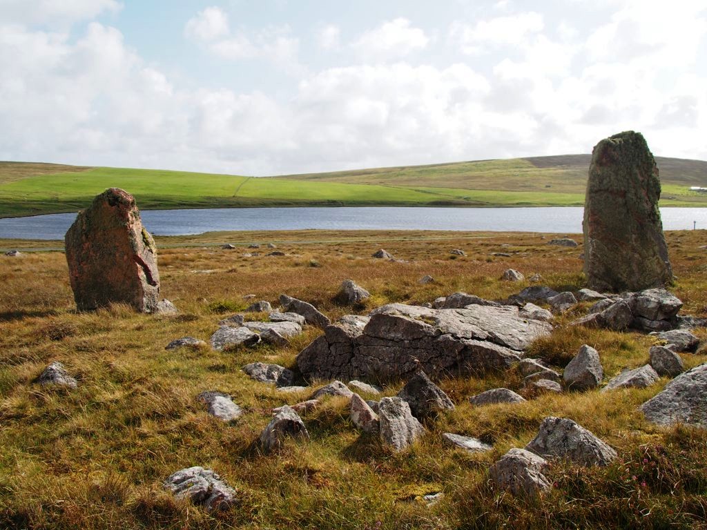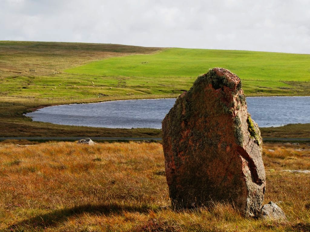Étant donné que les Shetland sont une destination plutôt très hors des sentiers battus, les informations sur certains endroits sont difficiles à trouver. Nous avions envie de voir quelques pierres levées, et avions entendu parler de celles de Housetter dans un guide, mais une fois sur place, aucun panneau ni signe pour les indiquer ! On a marché dans de la lande bien boueuse autour de la route enfin de finalement les apercevoir (elles n’étaient pas bien loin de la route, mais vu leur couleur elles se fondaient dans le paysage), face au loch de Housetter.