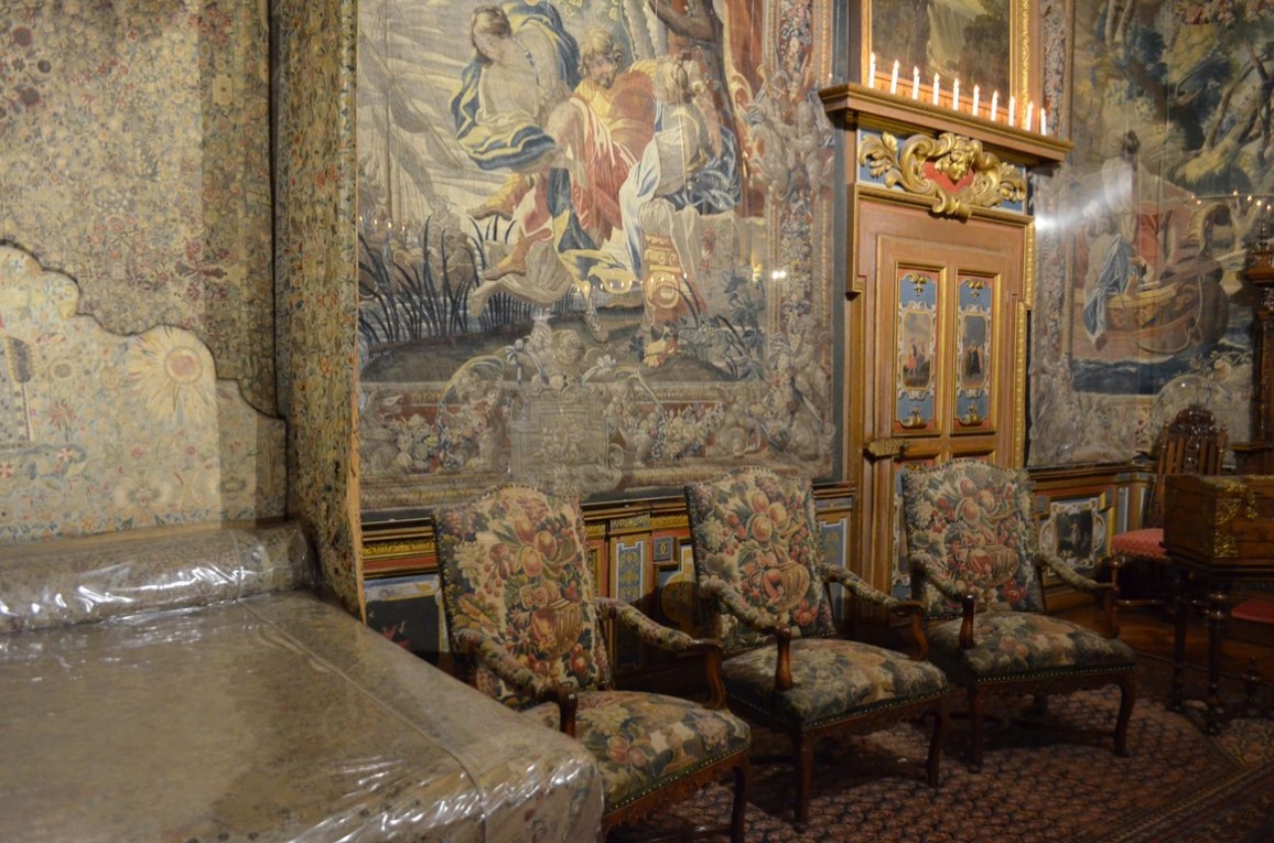 Nous passons maintenant à la salle d’armes, où se trouve également une belle tapisserie des Gobelins du 17ème siècle.