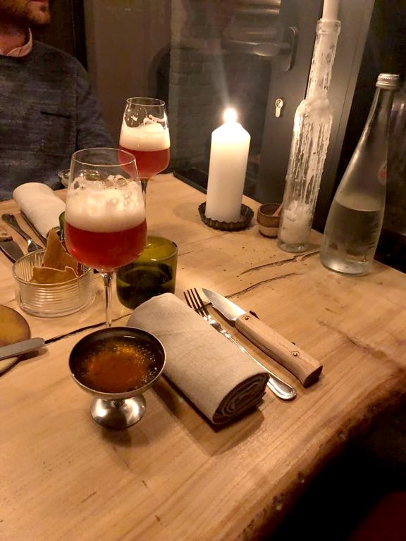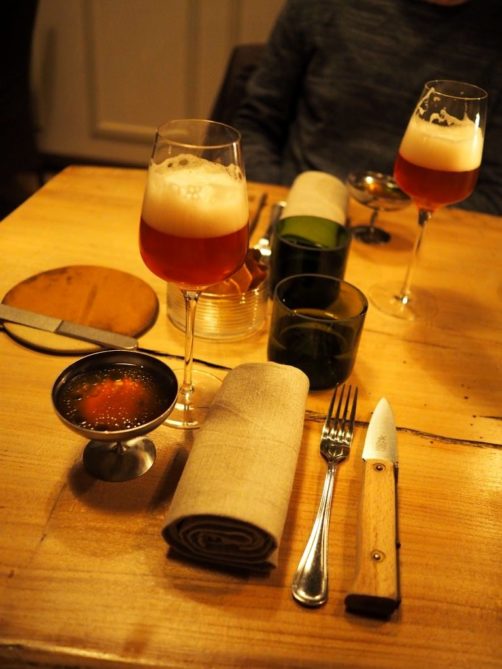 Pour une expérience complète, nous choisissons le grand menu, accompagné d’un accord boisson (20€ ou 30€ en fonction de la taille du menu), qui alterne entre vins, bières et préparations maison.