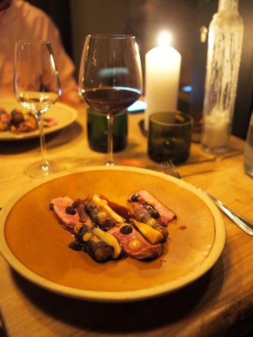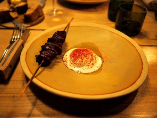 Le prochain plat était 100% végétarien, avec au centre de l’assiette un produit bien d’ici mais qu’on avait jamais dégusté comme ça : un kebab de betterave rôties, espuma de yaourt, huile de sapin, câpres d’ail des ours.