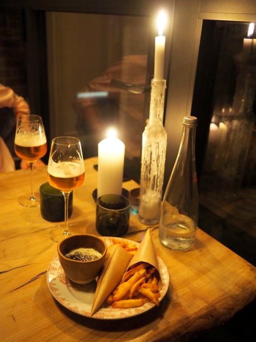 Mais une surprise suivant encore… un vrai cornet de frites ! A la bonne graisse et double friture bien entendu, accompagnée d’une délicieuse sauce au Maroilles. Même si on est déjà bien repu, impossible de résister… C’est un régal !