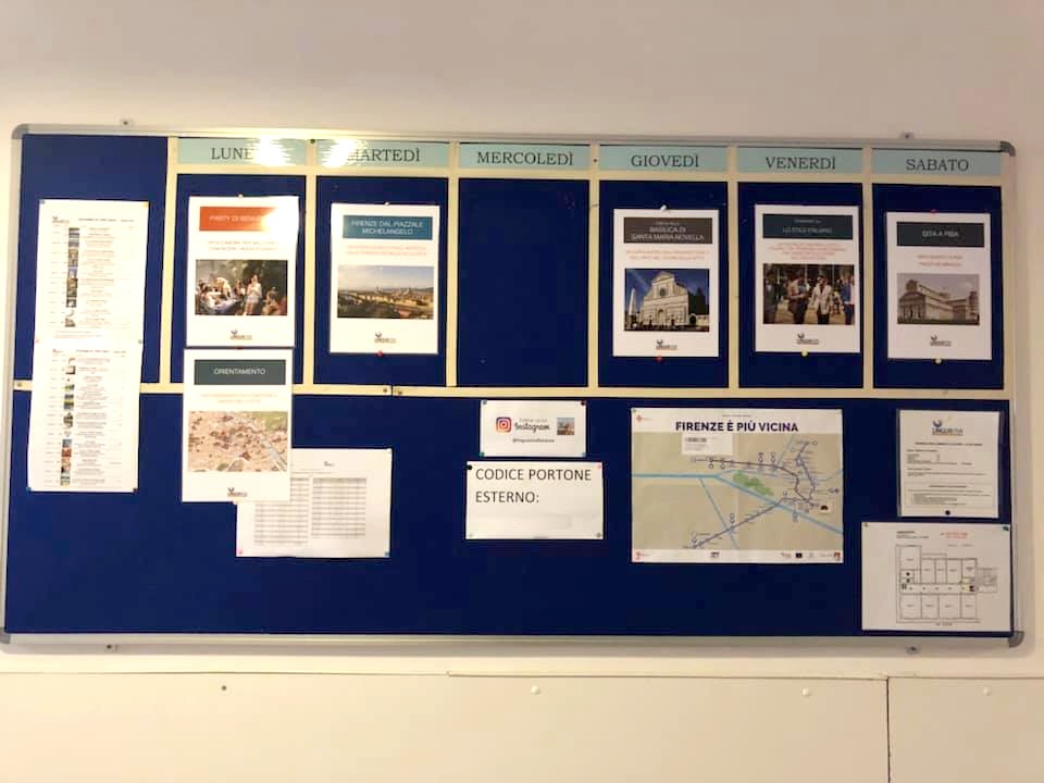 Le même jour, nous avons eu une séance d’information où l’on nous a expliqué comment fonctionnait l’école, donné des indications pour découvrir la ville, etc. L’école propose chaque semaine un programme d’excursions et de visites pour découvrir Florence et sa région. Il y a environs 5 activités (certaines payantes, d’autres gratuites) par semaine : visite guidée d’un musée ou d’un endroit, repas ou apéritif entre élèves, conférences,… Si vous n’avez pas envie d’explorer par vous-même, c’est une bonne solution !