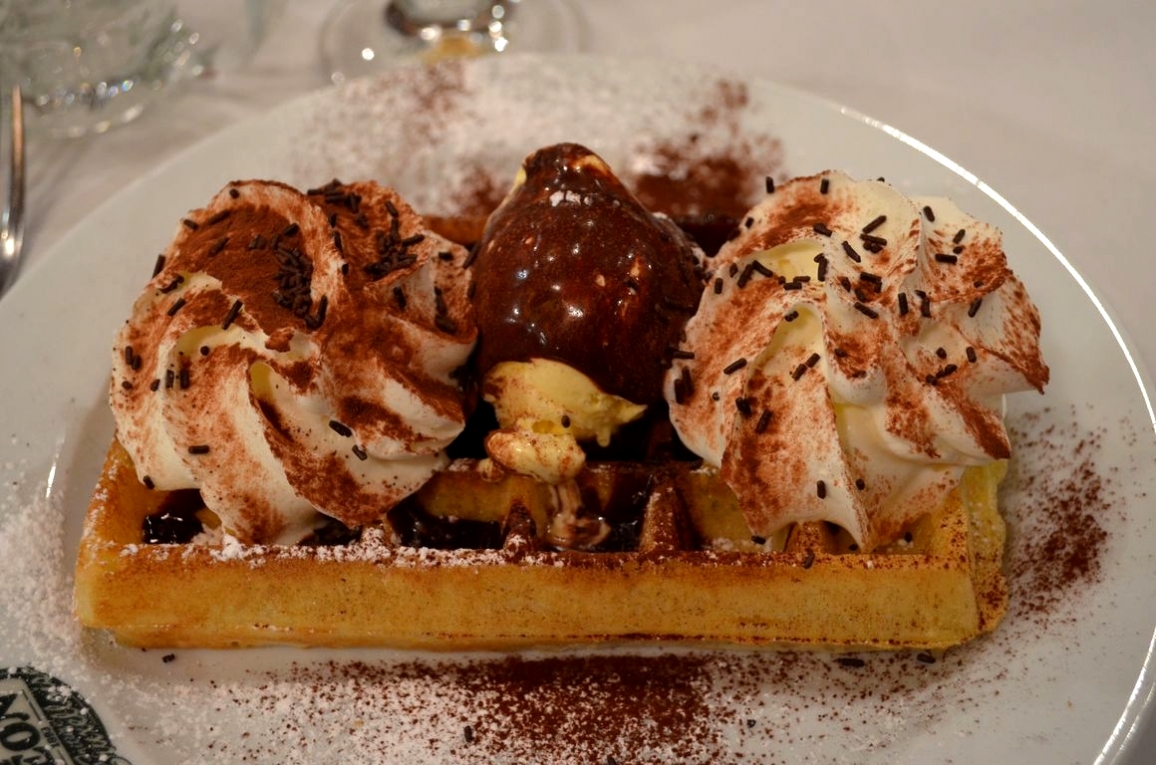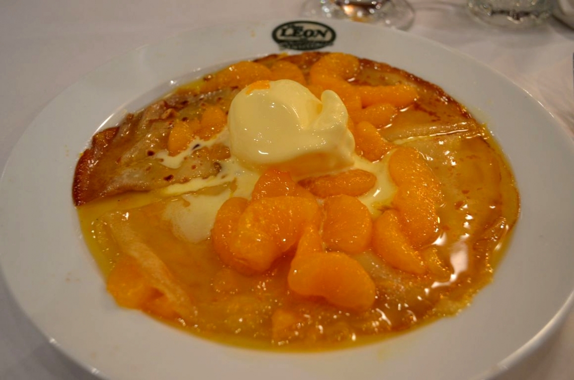 Enfin, en dessert, Fred s’est laissé tenté par la Gaufre « Léon », une gaufre de Bruxelles généreusement recouverte de glace vanille, chantilly et coulis de chocolat. Quant à moi, je me suis régalée avec les crêpes « Léon » flambées avec glace vanilles et mandarines. Les desserts sont vraiment servis en bonnes portions !