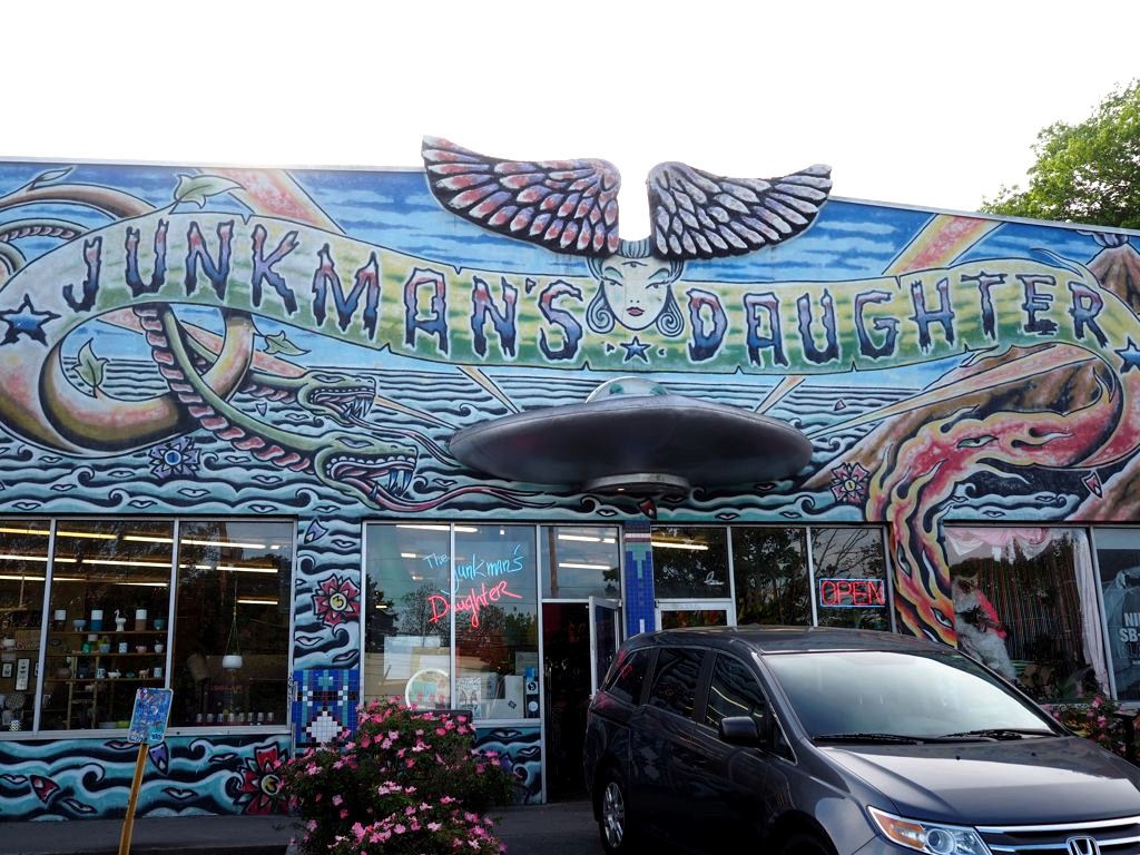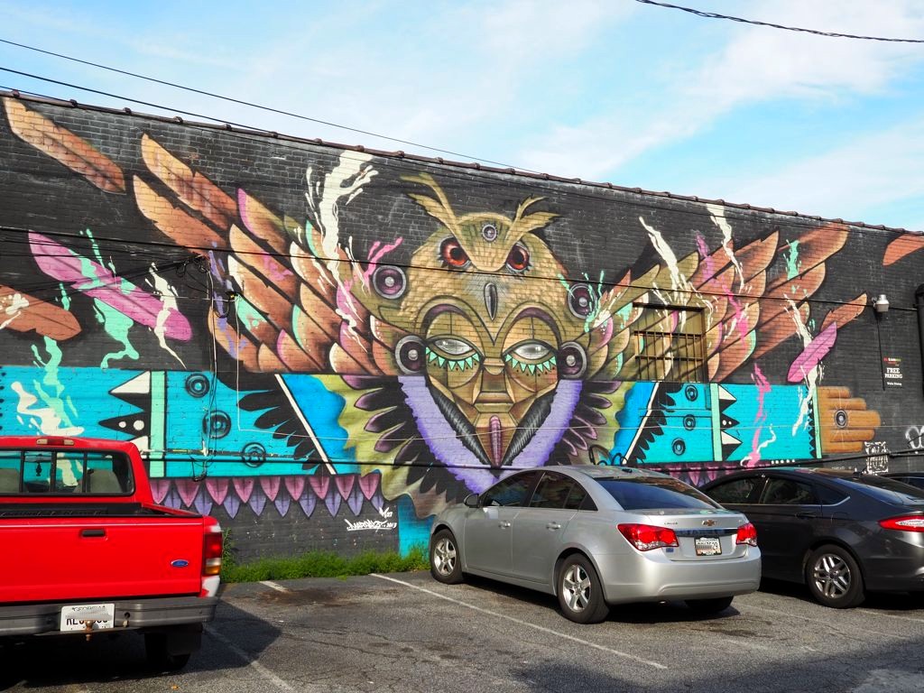 Pour notre première après-midi à Atlanta, on a visité LE quartier hipster par excellence d’Atlanta, Little Five Points (L5P pour les intimes), avec ses petits magasins et nombreux street art. On a plus ou moins suivi la balade street art détaillée sur ce site. On a aussi fait un peu de shopping dans un des magasins originaux du quartier, Junkman’s Daughter (pas mal si vous avez envie de ramener des souvenirs un peu extravagants !).