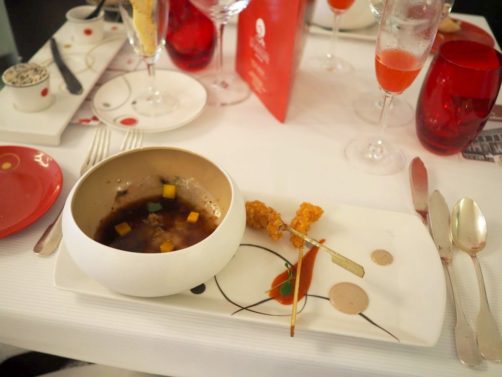Après trois petites mises en bouche (et un peu de pain agrémenté du beurre aux algues de la maison), nous avons dégusté en première entrée le carpaccio de langoustine, friture de langoustine, bouillon de carapace au gingembre, mangue, shizo, coriandre. Un plat aux accents exotiques, à la mode asiatique.