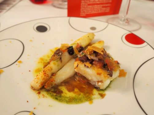 Nous avons poursuivi avec un plat plus classique, et qui a eu ma faveur, les filets de vive, asperges rôties, parmesan 40 ans et vinaigrette d’olive noire, tomate, basilic. Un plat gourmand avec des cuissons très réussies.