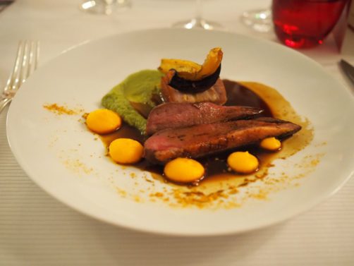 Côté viande, nous avons dégusté des aiguillettes de canette fermière, accompagnées de petits pois lard demi-sel, carottes confites au four, et jus de veau au curry.