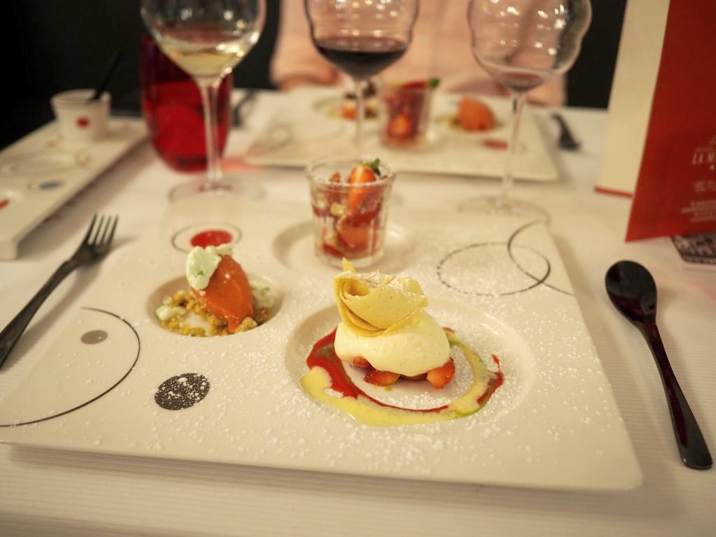 Enfin, nous avons fini par une petite note sucrée avec un délicieux dessert autour de la fraise, en trois déclinaisons avec respectivement estragon, huile d’olive et meringue.