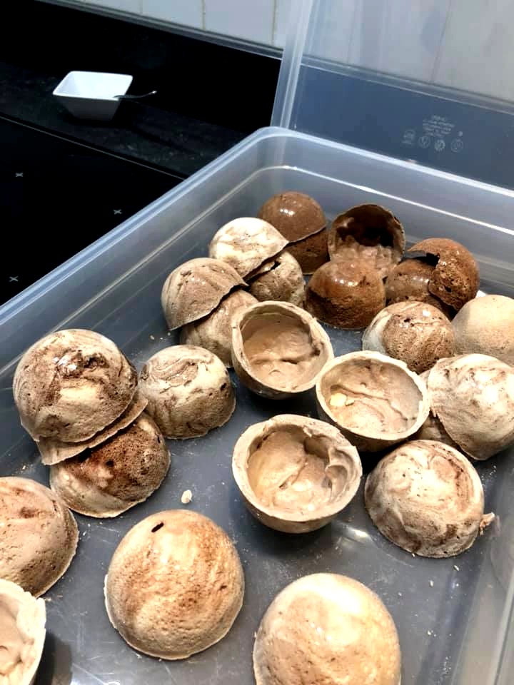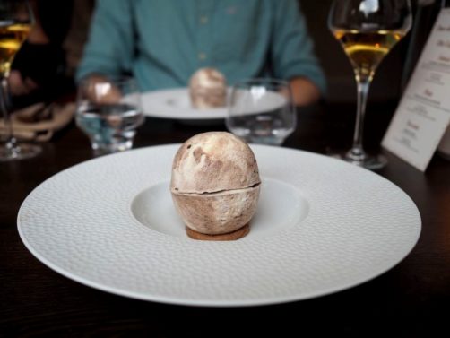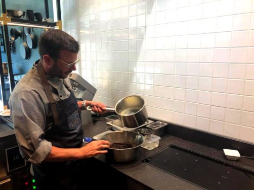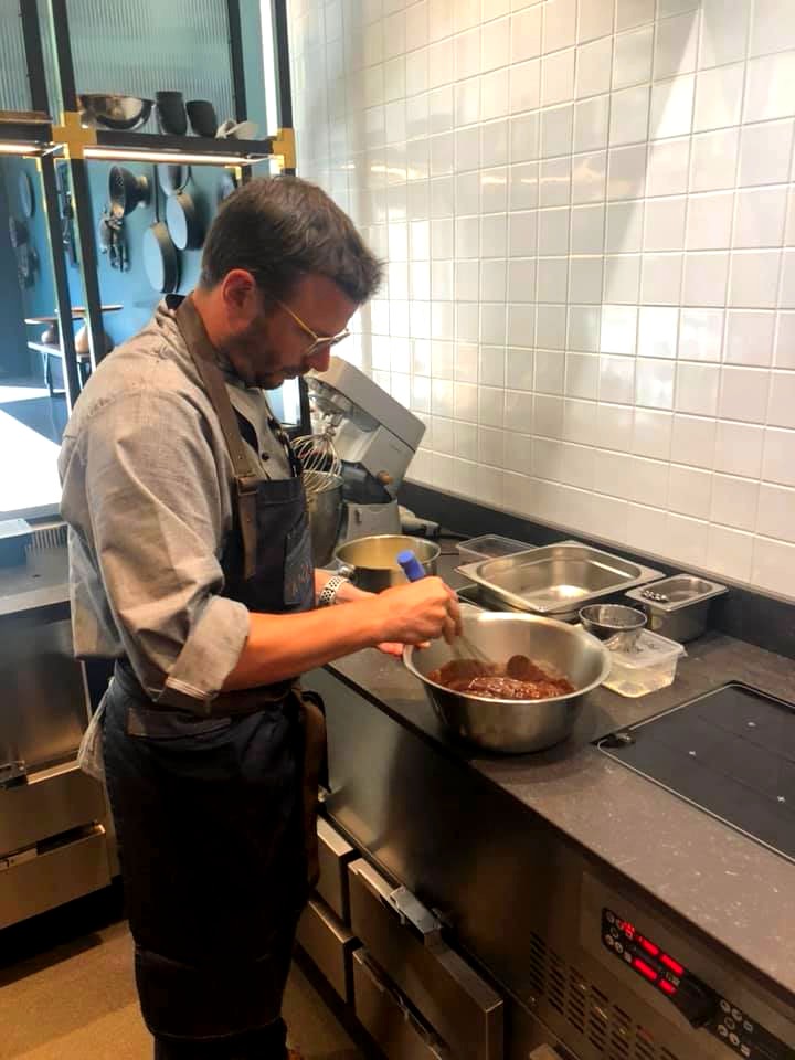 Le premier groupe ayant préparé l’entrée, lors de notre atelier culinaire avec Jean-Philippe Watteyne, nous avons appris à préparer son dessert signature, la sphère, ici au cacao, banane et spéculoos. Évidemment, l’atelier s’est fait dans la bonne humeur ! C’était intéressant et nous avons eu droit à un petit carnet avec toutes les recettes du menu que nous allions déguster.