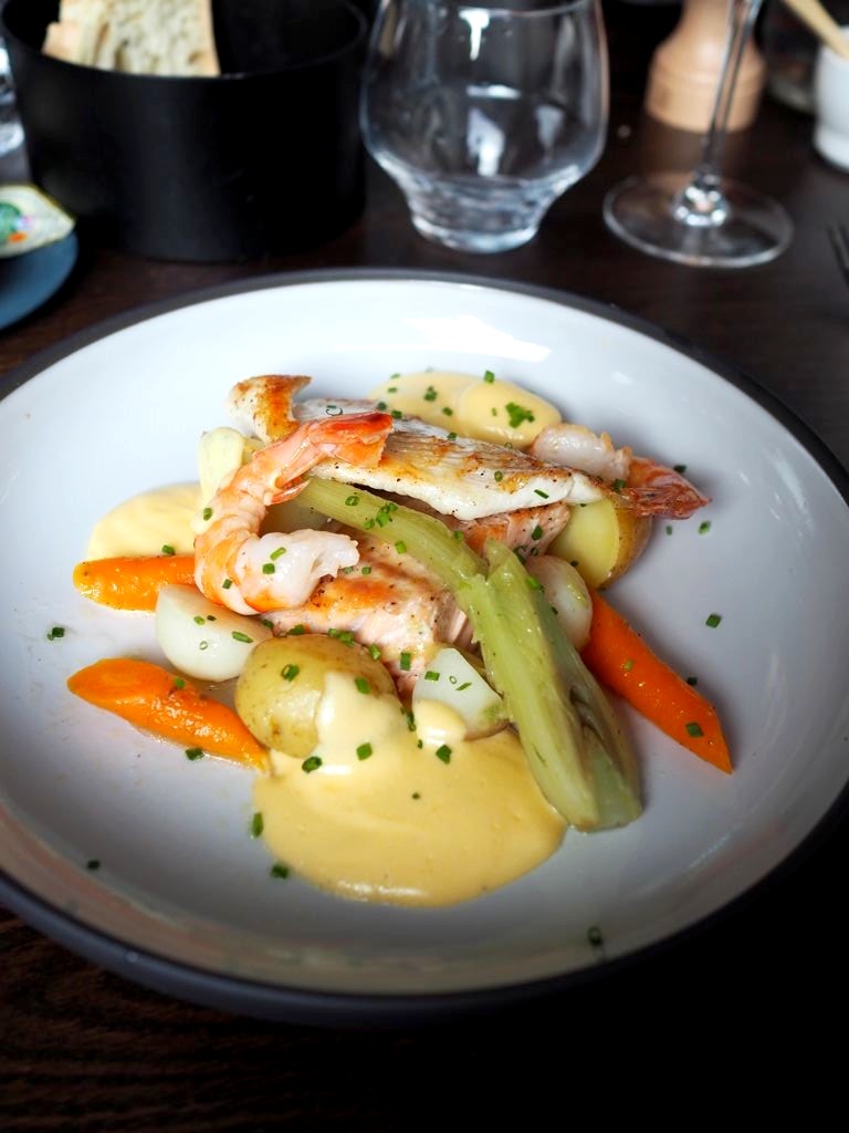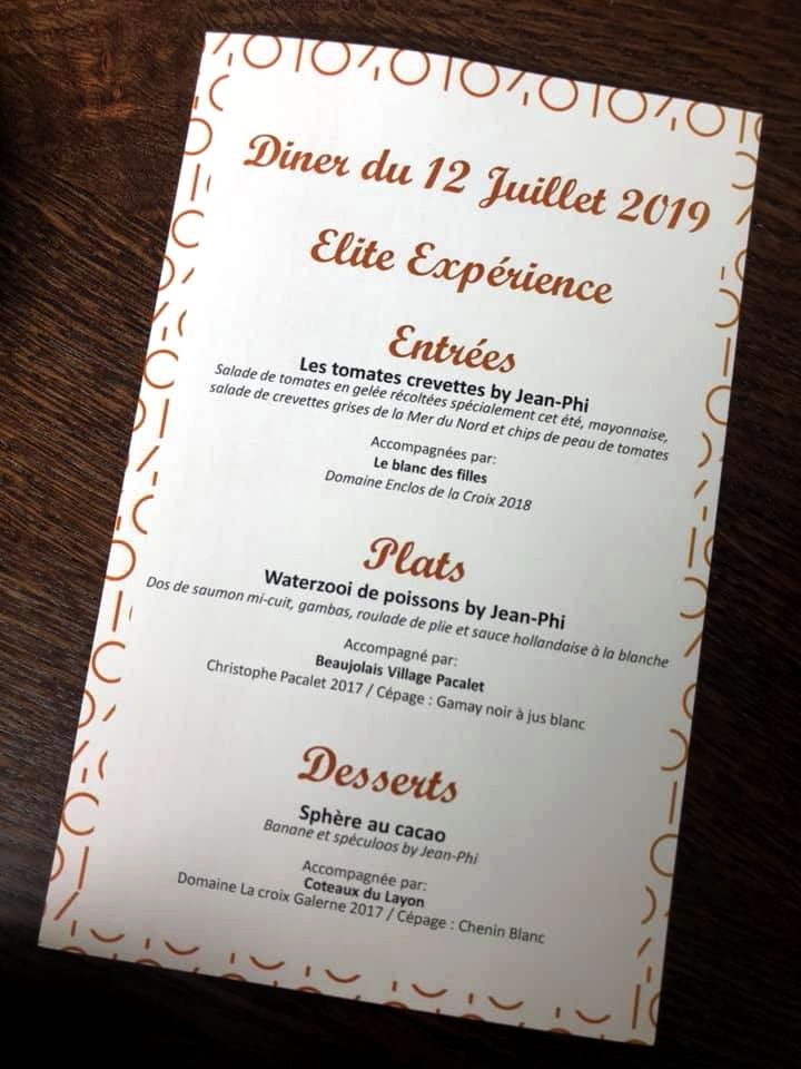 Ensuite, retour au bar (encore !) pour l’apéritif, avant de passer dans la salle de restaurant. Pour l’occasion, un groupe était venu s’occuper de l’animation musicale de la soirée ! Nous avons mangé un menu Signature 3 services (avec accords vins) avec en entrée, les tomates crevettes revisitées de Jean-Phi, en plat le waterzooi de poissons de Jean-Phi et en dessert la fameuse sphère.