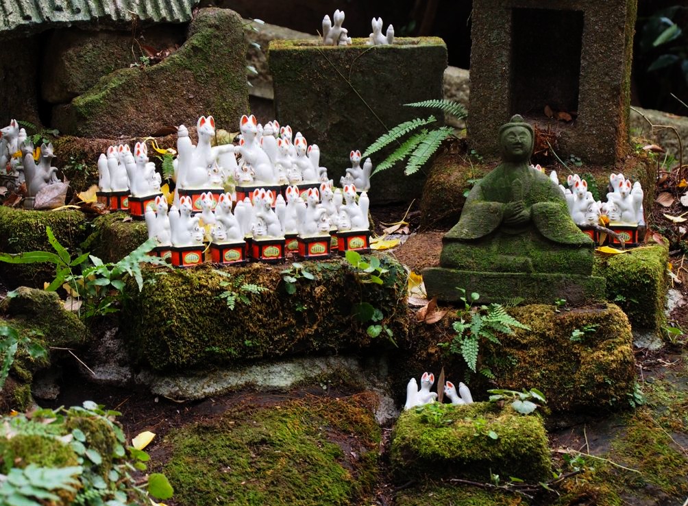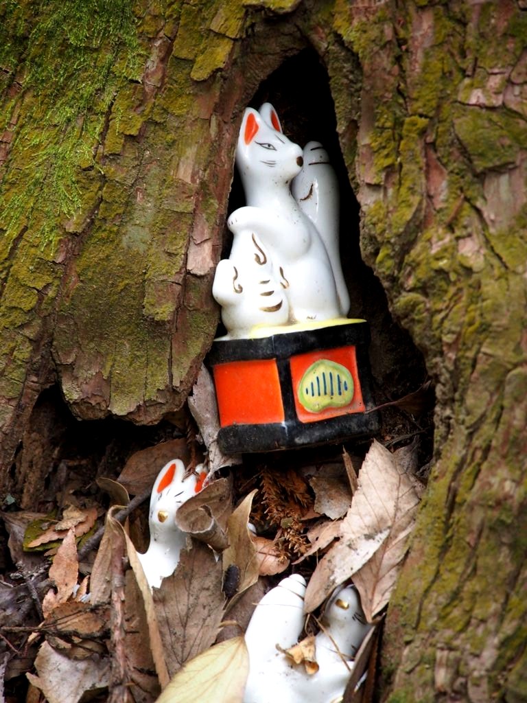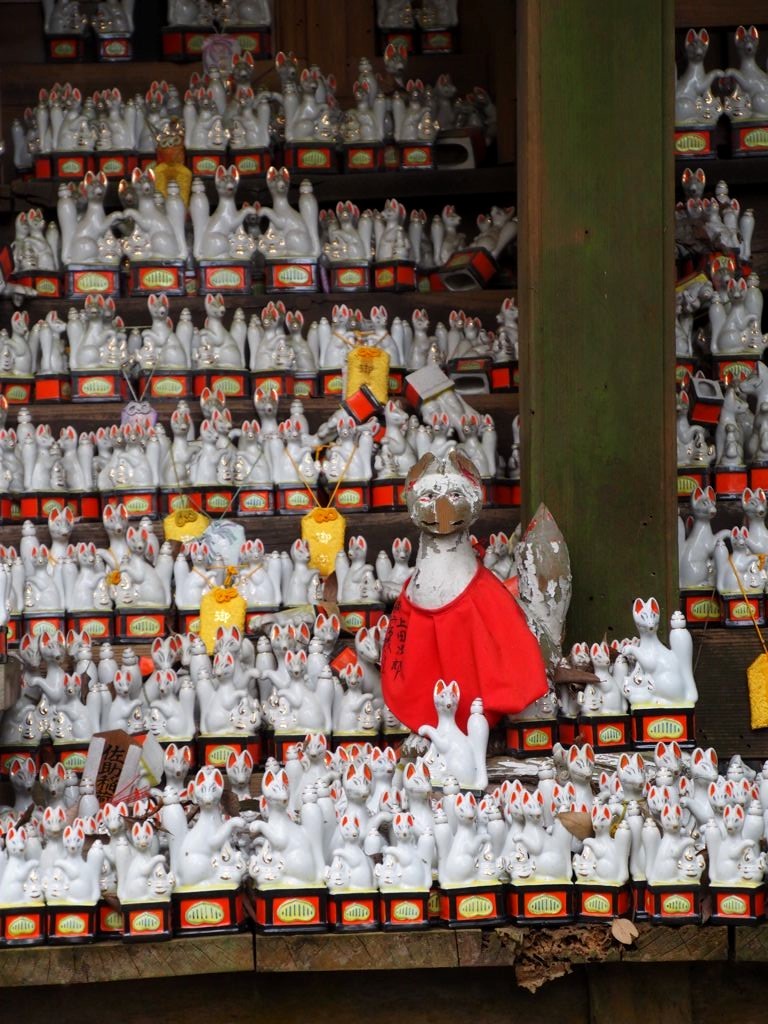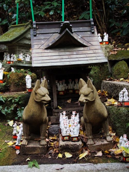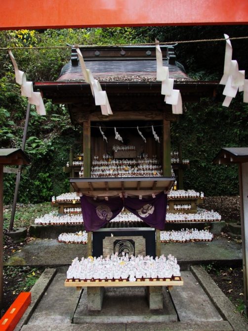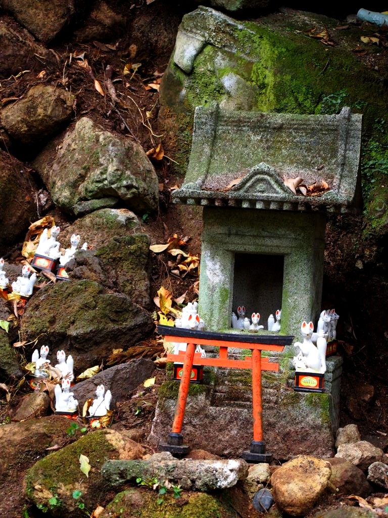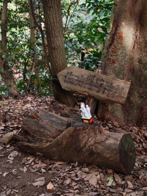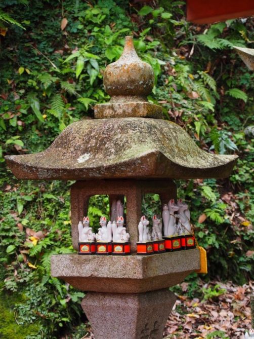 Après avoir repris le sentier, un peu plus loin, un autre petit détour permet de découvrir le sanctuaire de Sasuke Inari. Je n’ai pas compris pourquoi il y avait si peu de touristes dans ce temple, car pourtant il a tout pour plaire : perdu au milieu de la forêt, sa direction est donnée par des petites statuettes en forme de renards (kitsune), disposées au sol, dans les arbres,… et de plus en plus nombreuses à l’approche du temple qui leur est dédié.