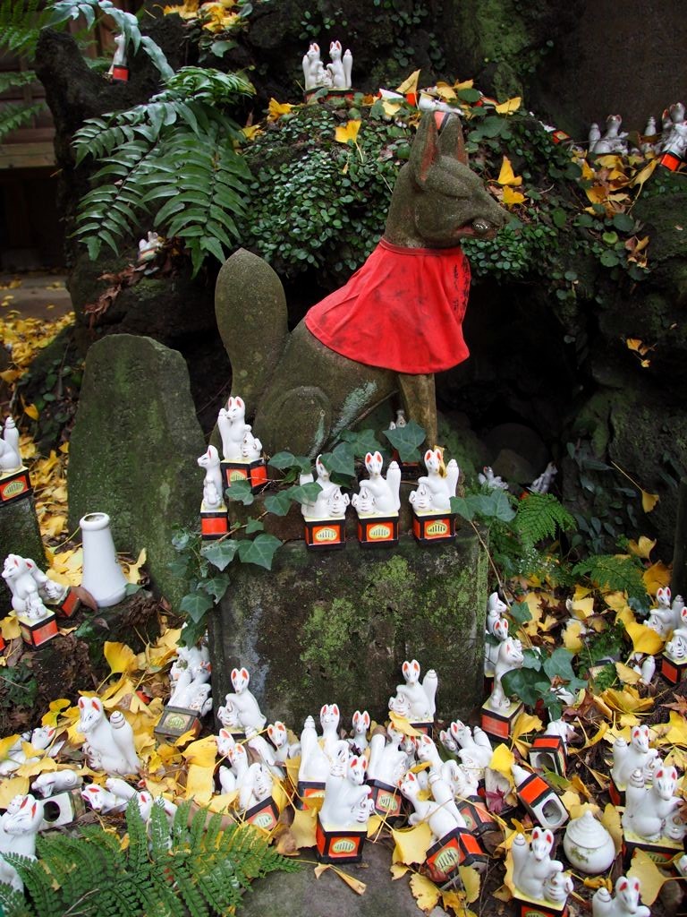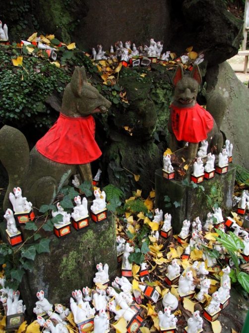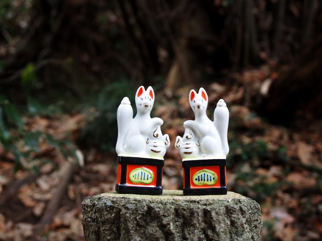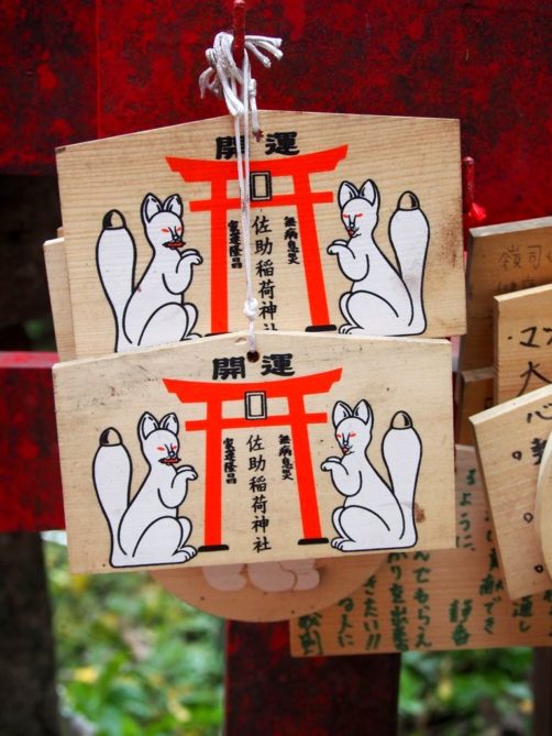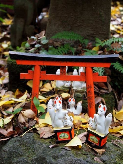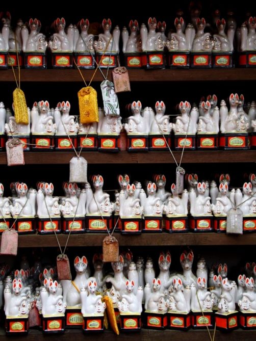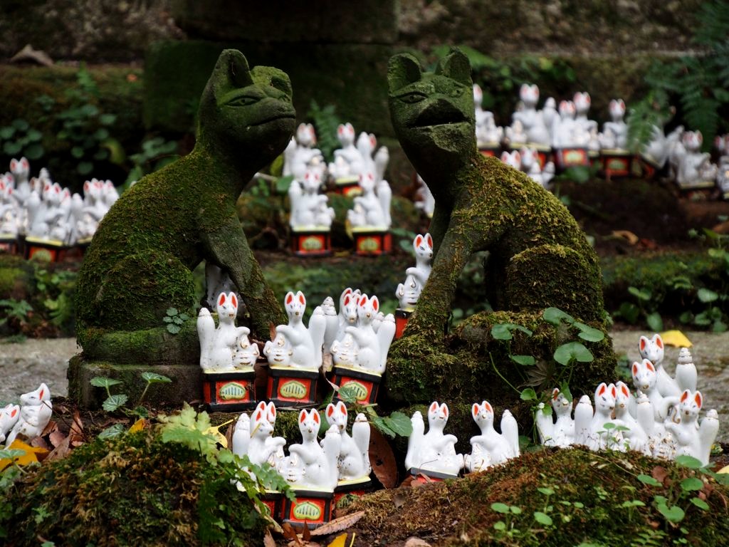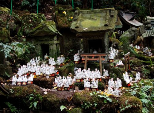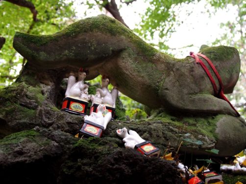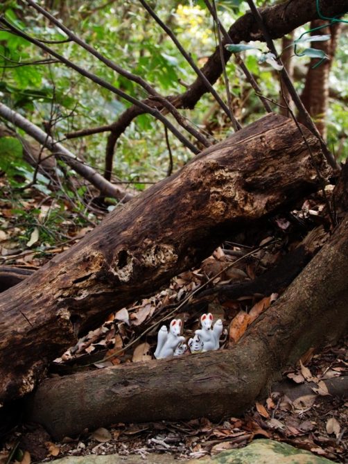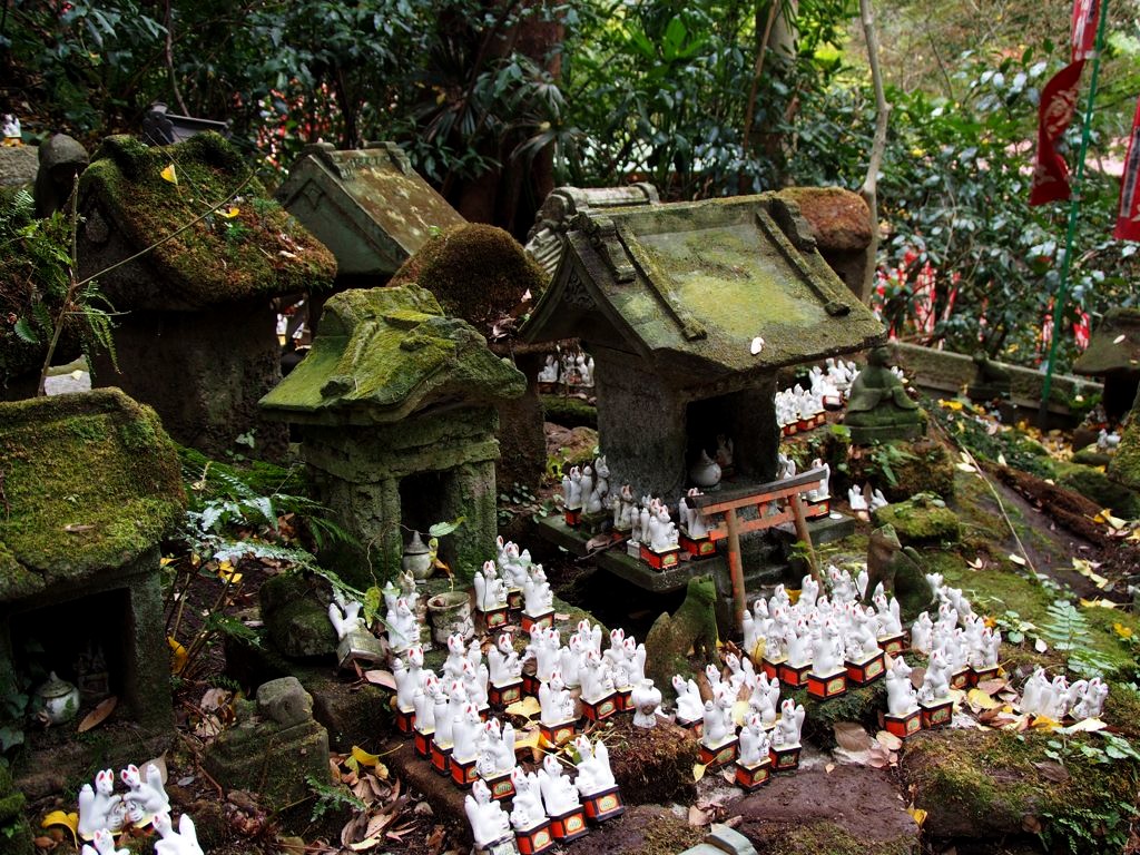 Après avoir repris le sentier, un peu plus loin, un autre petit détour permet de découvrir le sanctuaire de Sasuke Inari. Je n’ai pas compris pourquoi il y avait si peu de touristes dans ce temple, car pourtant il a tout pour plaire : perdu au milieu de la forêt, sa direction est donnée par des petites statuettes en forme de renards (kitsune), disposées au sol, dans les arbres,… et de plus en plus nombreuses à l’approche du temple qui leur est dédié.