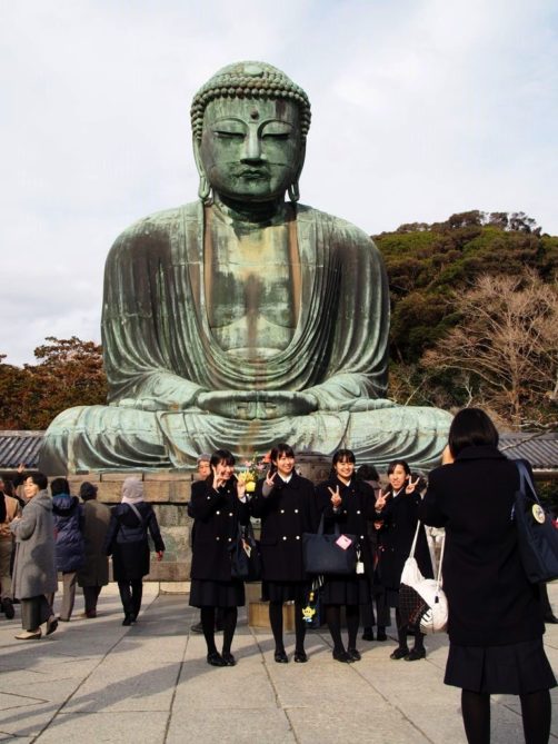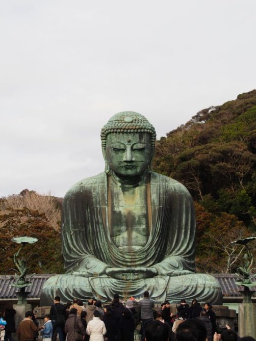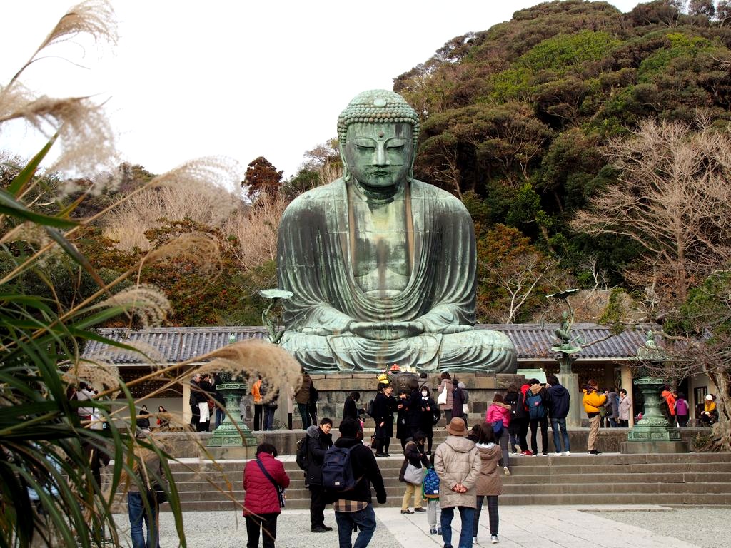 Après une grande descente, le sentier de randonnée se termine près au temple de Kotoku-in où se trouve le Grand Bouddha (Daibutsu) de Kamakura. C’est la deuxième plus grande statue de Bouddha au Japon après celle de Nara. Pour quelques yens en plus, on peut même entrer dans la statue, pour découvrir de l’intérieur son armature. Impressionnant !