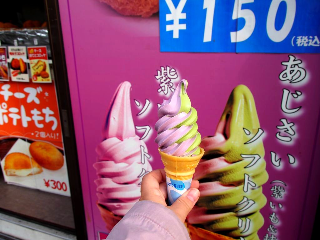 Après l’effort, le réconfort ! Comme il y avait plein de petites boutiques et magasins près de la statue du Bouddha, j’ai fait deux petites pauses gourmandes avant de continuer ma visite. J’ai d’abord goûté à l’une des spécialités de Kamakura, la patate douce, qui se mange ici en beignet ou en glace. J’ai pris la version glacée… mélangée à du matcha, on ne se refait pas ! C’était très bon.