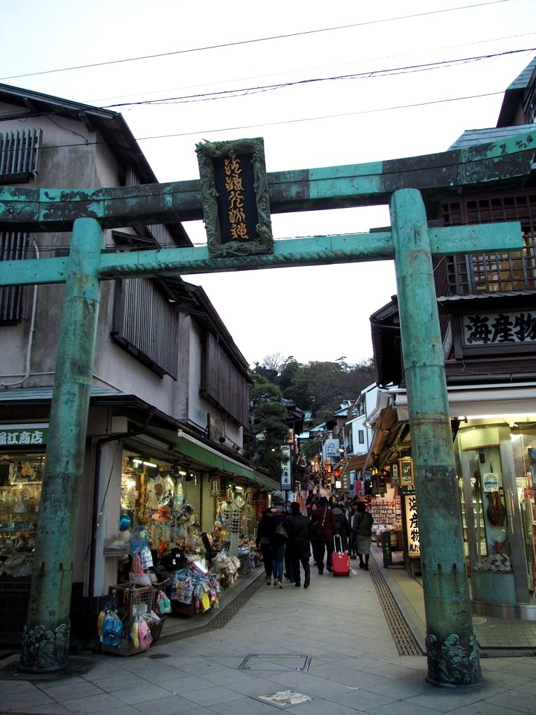 Après avoir fait la tournée des temples à Kamakura, on a pris le train quelques arrêts direction la presqu’île de Enoshima, connue pour ses restaurants de poisson.