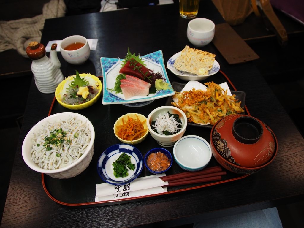 La spécialité d’Enoshima, ce sont les micro-poissons style petite friture (« whitebait » en anglais). Sauf qu’ici, on ne les mange pas que frits : on les prépare aussi bouillis… voir crus ! J’aime goûter à tout mais j’ai eu un peu du mal là, je l’avoue. Vous trouverez toute une ribambelle de restaurants qui proposent ce type de mets sur l’île. On a mangé à Enoshima-tei, qui proposait un set menu à prix abordable qui permettait de goûter le « whitebait » en plusieurs préparations. Heureusement, cela incluait aussi d’excellents sashimis !