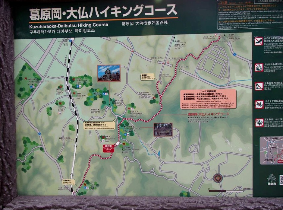 J’ai ensuite commencé le Daibutsu Trail ou Daibutsu Hiking Course, qui permet de découvrir de petits temples peu visités sur les hauteurs de la ville. Vous devriez trouver facilement le plan et les flèches du parcours, mais si ce n’est pas le cas, je vous mets une photo ici (le plus facile est cependant de placer les différents points sur une carte Google que vous rendez accessible hors ligne pour être sur de ne pas vous perdre).
