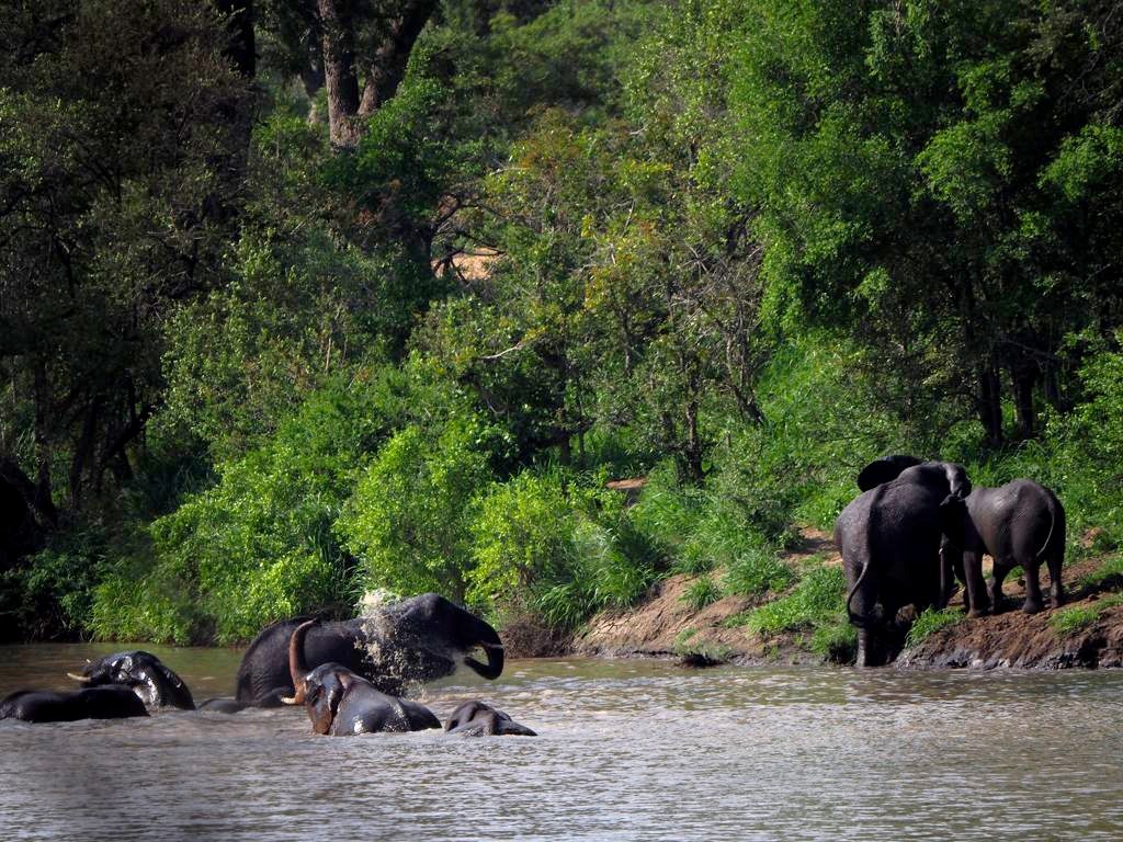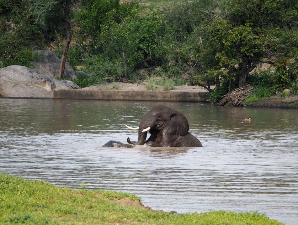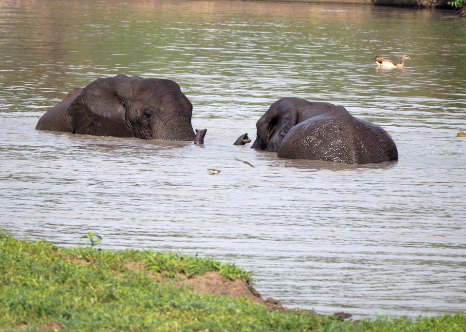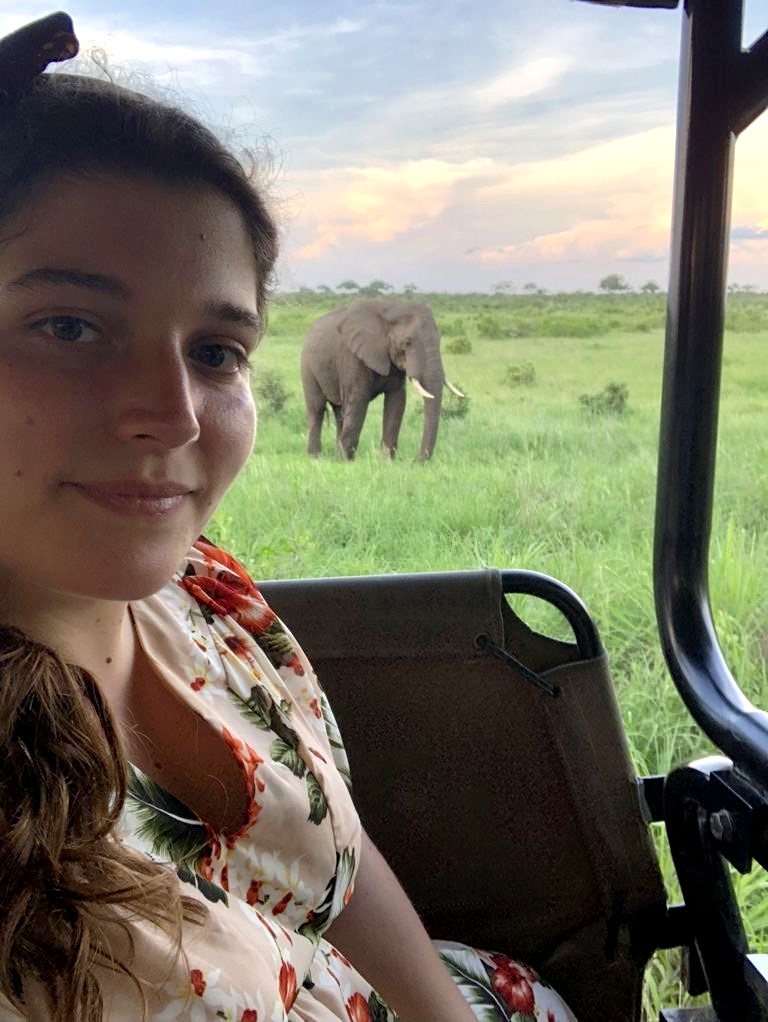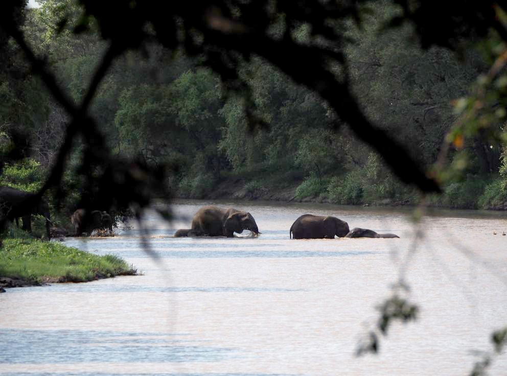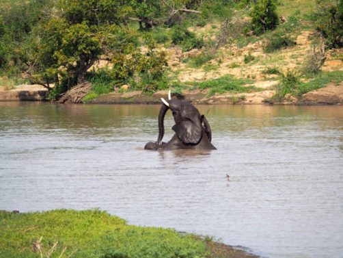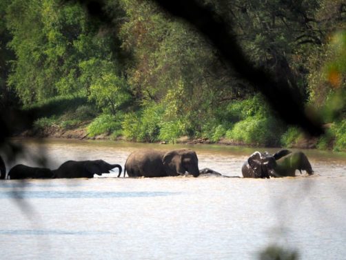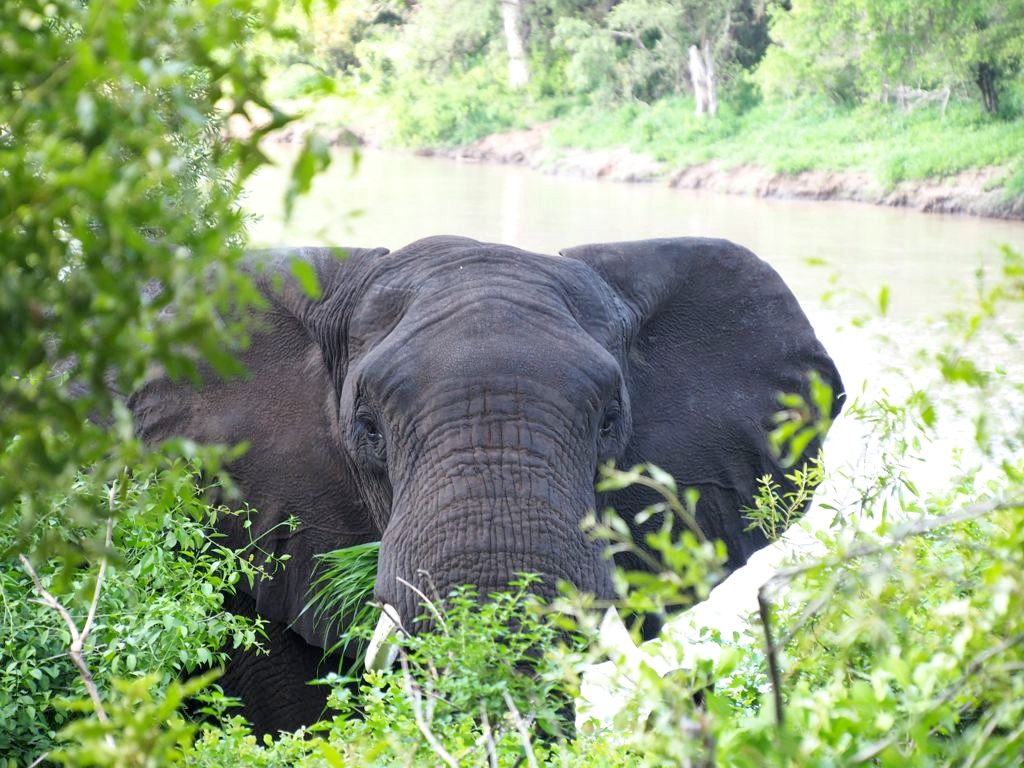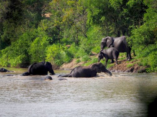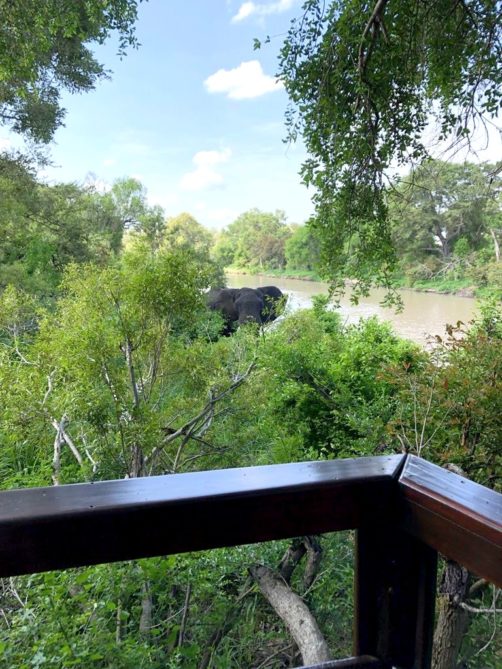 L’après-midi à la piscine, lui, va tourner court… car soudain un éléphant traverse la rivière en direction du lodge. On le retrouve juste à côté d’une des tentes : il est à moins de 10 mètres et on se sent plutôt petits face à lui ! On se rend compte qu’il y a en fait des éléphants de tous les côtés (toute la smala vue le premier jour était là !) et c’était trop cool de pouvoir les observer depuis notre terrasse ! Ils s’amusaient dans l’eau comme des petits fous ! On les a aussi vu retraverser la rivière tous ensemble, c’était vraiment magique.