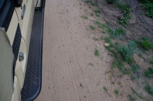 Rapidement, aidés d’une autre jeep, on quitte la piste pour suivre les traces des lions dans la brousse. L’autre jeep fini par abandonner et on continue seuls. Et tout à coup, du côté que Themba ne peut pas voir, je revois leurs traces ! On est vraiment près du campement…