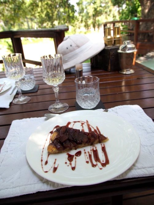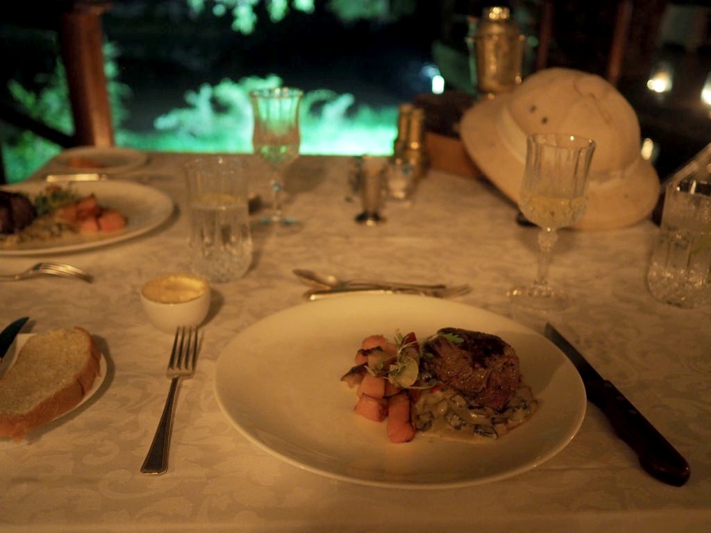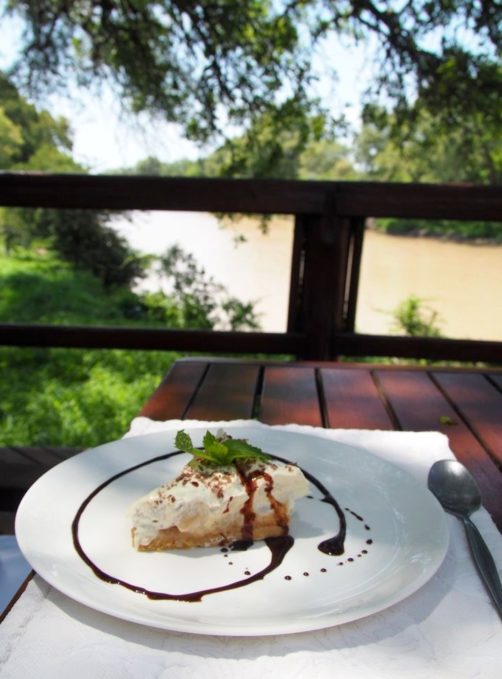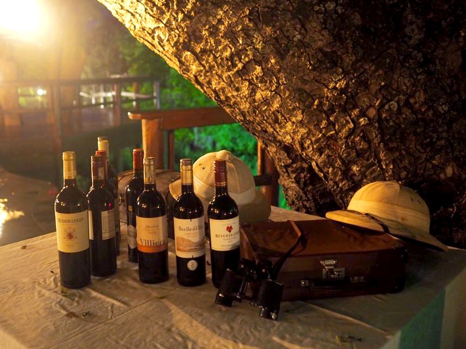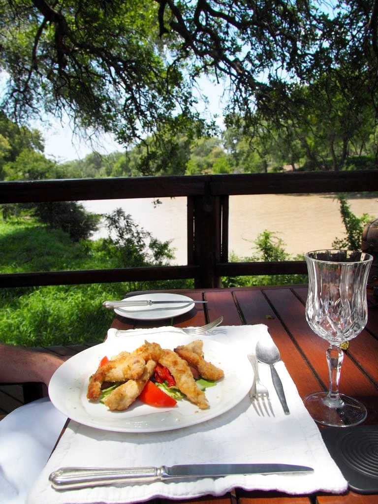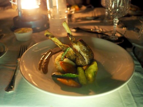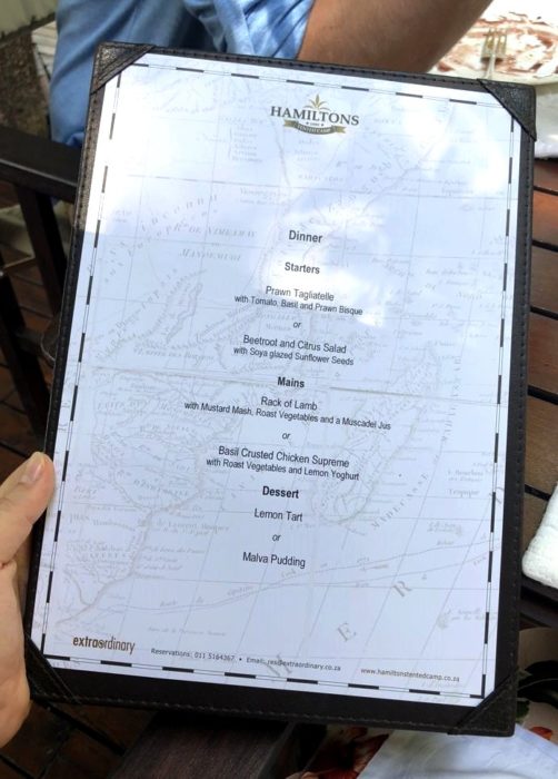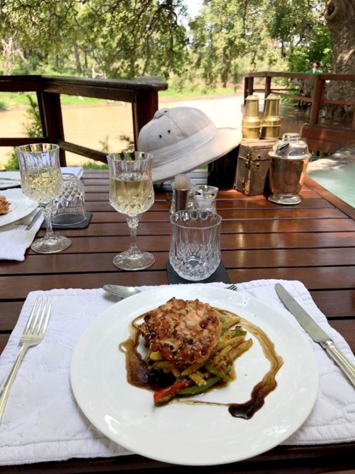 Le repas change tous les jours et nous y avons vraiment bien mangé considérant qu’on était, ne l’oublions pas, au beau milieu de nulle part. Nous avions à chaque fois un service plat – dessert le midi et entrée – plat – dessert le soir, avec 2 choix de plats par service. A part pour ce premier repas, on devait toujours confirmer son choix au repas du soir pour le lendemain midi, et le midi pour le soir. Si vous avez déjà voyagé en Afrique, vous savez que les temps de préparation peuvent parfois être longs, très longs… du coup c’est une bonne manière d’avoir un service au taquet ! Au niveau des vins, étant en Afrique du Sud, nous avons bien sur été gâtés !