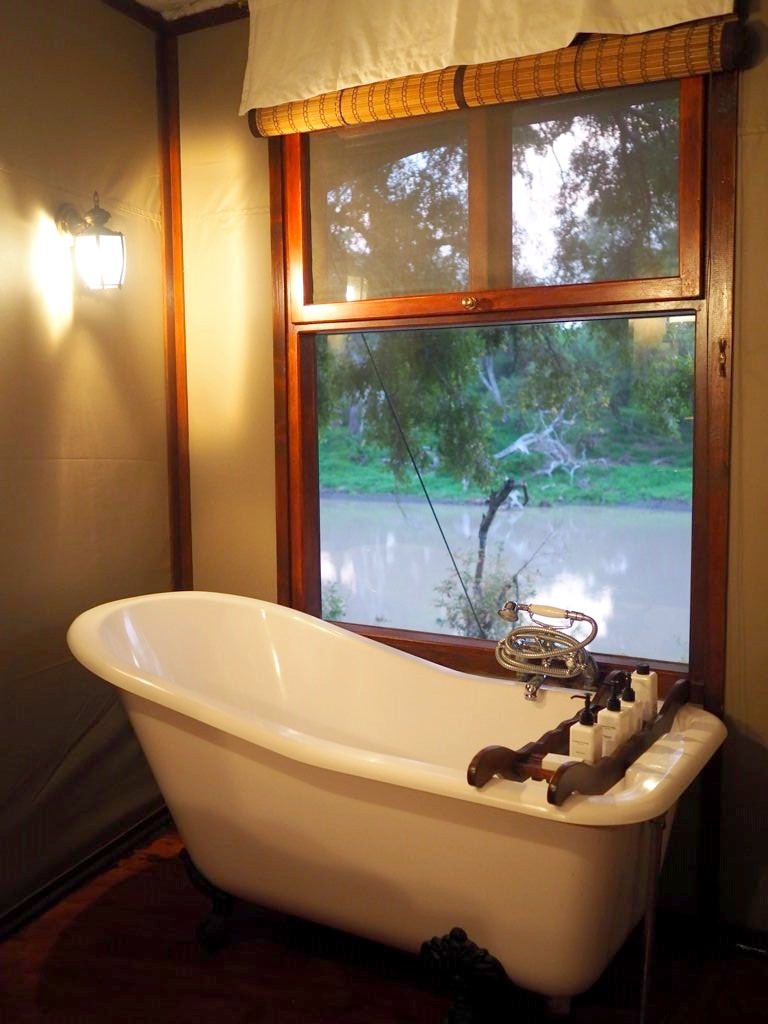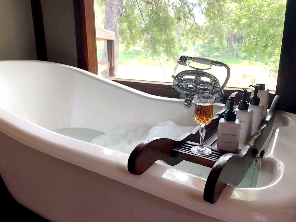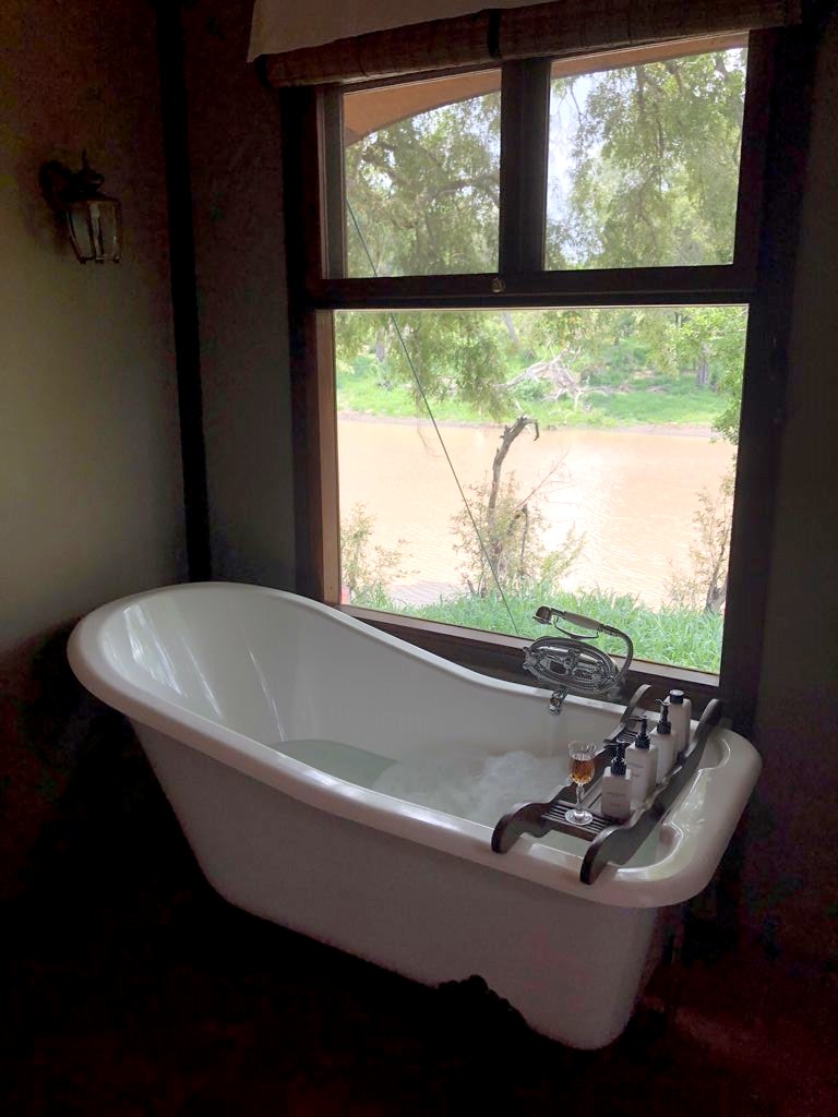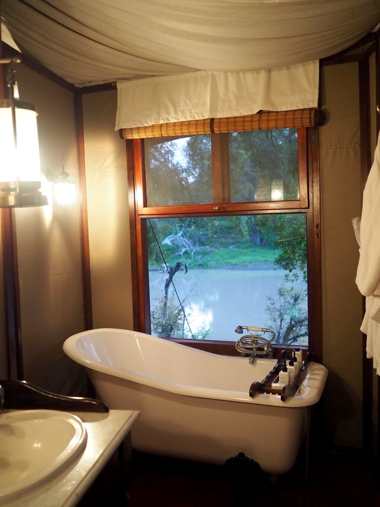 Mais la meilleure partie reste la salle de bain, avec sa splendide baignoire sur pied avec vue sur la rivière (d’où on peut observer les animaux avec un peu de chance !) et la douche extérieure ! Tout a été pensé jusque dans les moindres détails pour rappeler cette grande époque du safari, du « buzzer » d’urgence vintage aux contes sur les animaux de la savane déposés sur le lit lors du service du soir, jusqu’à la flasque de Cherry dans la chambre !