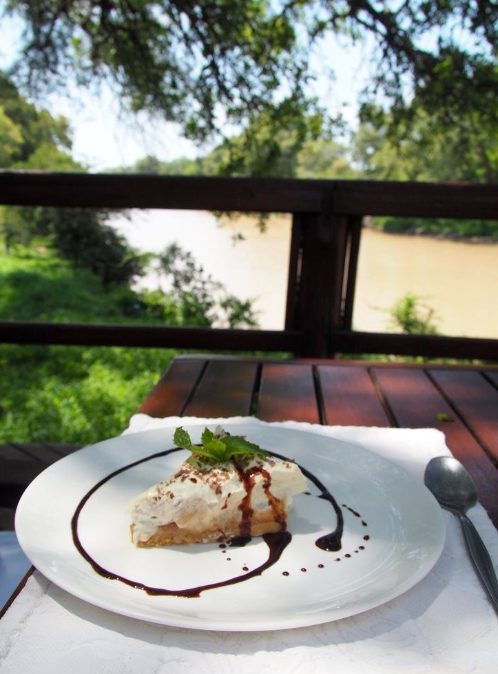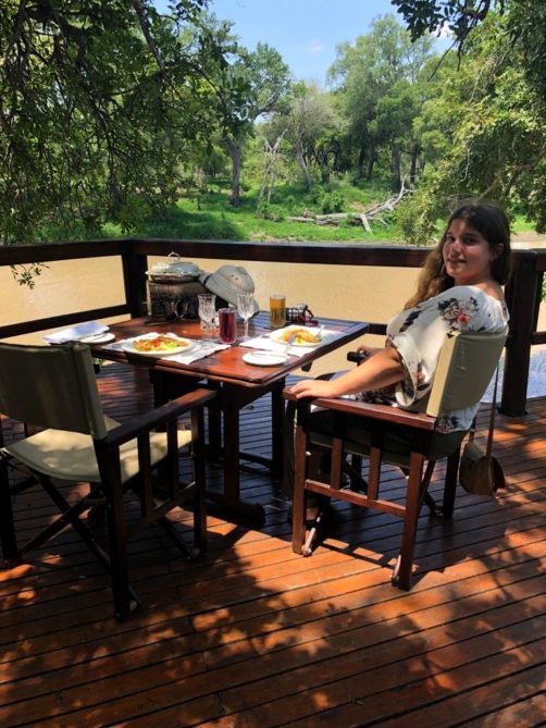 Après quelques heures de route (et nombreux arrêts !), sur des routes et pistes très praticables même avec une petite voiture, nous sommes arrivés pile à temps pour notre premier lunch au Hamilton’s, le premier repas compris dans la formule journalière. Nous avons été accueilli avec un petit verre et pris notre lunch, face à la rivière et aux animaux, pendant qu’on s’occupait de garer notre voiture, préparer notre chambre et y acheminer nos bagages.