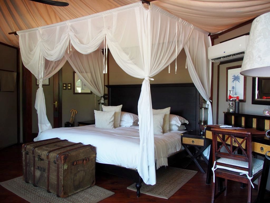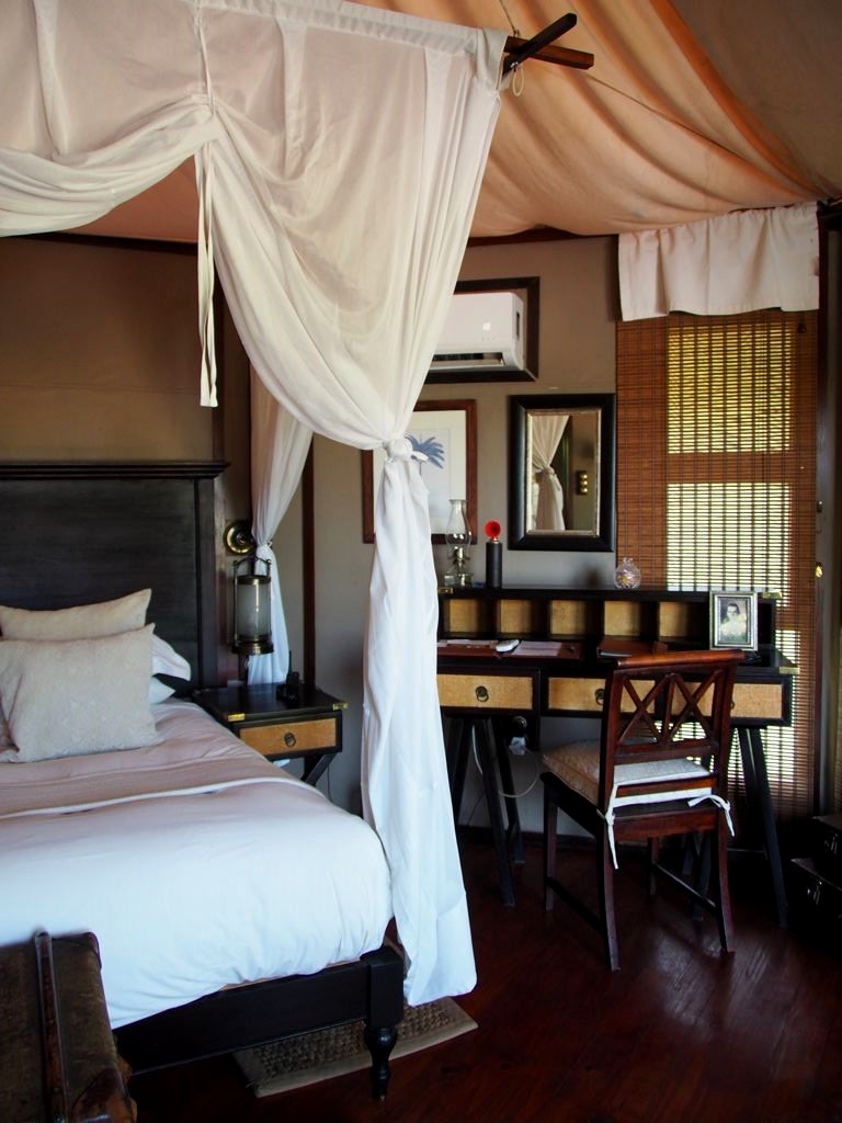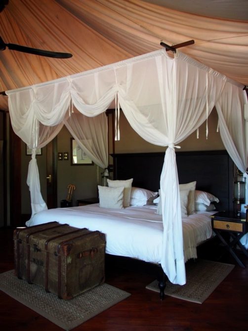 Le Hamilton’s ne possède que quelques tentes, toutes décorées dans ce style colonial qui rappelle les safaris du début du 20ème siècle, avec une terrasse face à une rivière au cœur du Kruger. On se trouve au beau milieu de nulle part, et pourtant tout le confort est là : les tentes sont climatisées (pour notre plus grand bonheur avec la chaleur qu’il fait à cette saison…), les lits possèdent une grande moustiquaires, le service de chambre est fait plusieurs fois par jour…