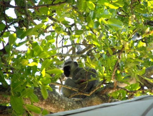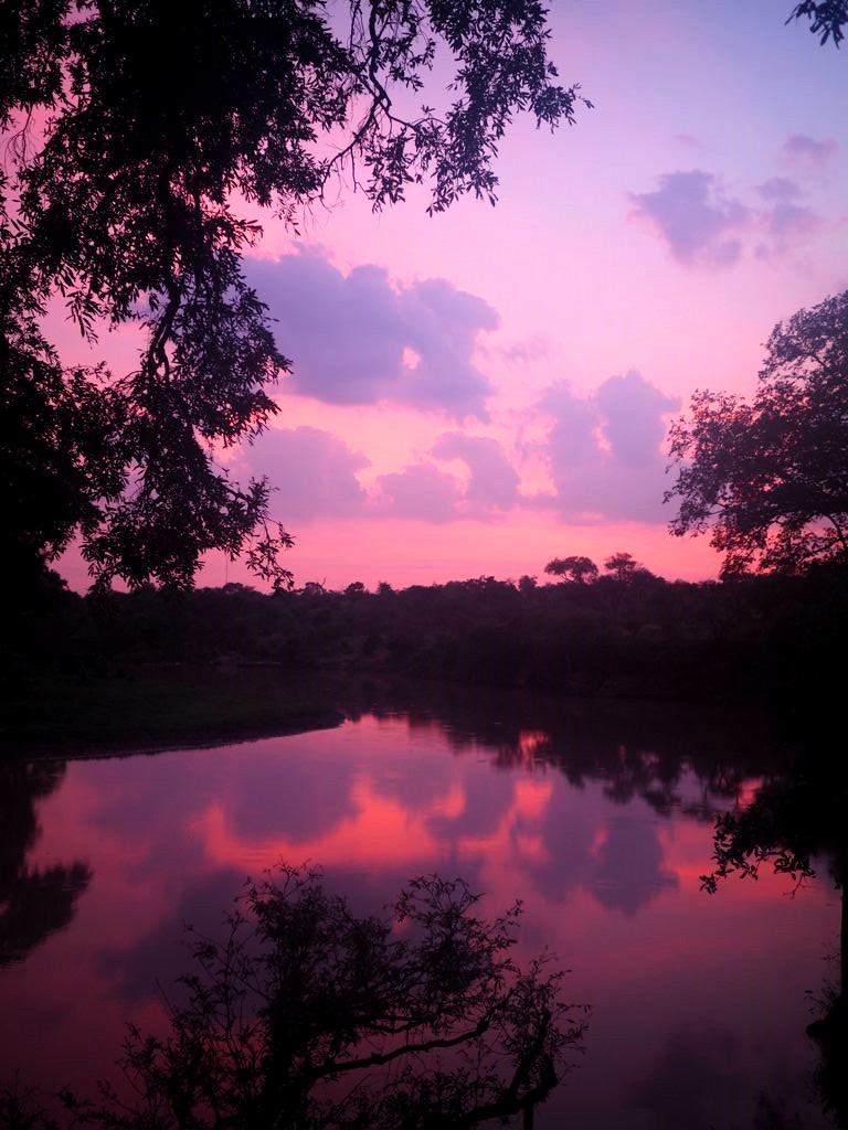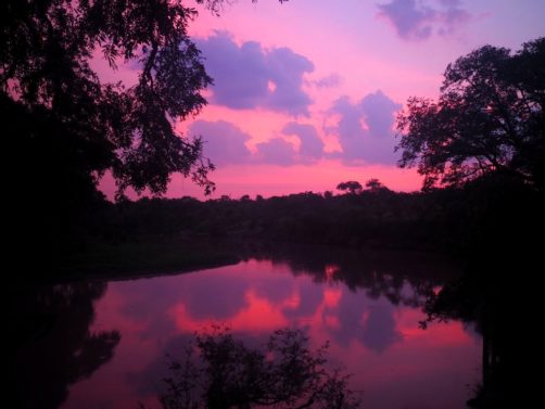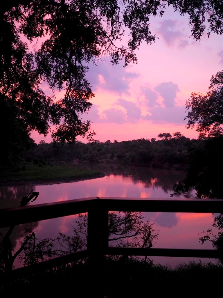 Themba vient nous réveiller. J’ouvre les stores de notre tente et… que le spectacle commence ! Le ciel est ROSE ! Un des plus beaux que j’ai jamais vu. Et les babouins ne se sont pas calmés : le roi de la jungle ne doit pas être allé bien loin. On croise les doigts !
