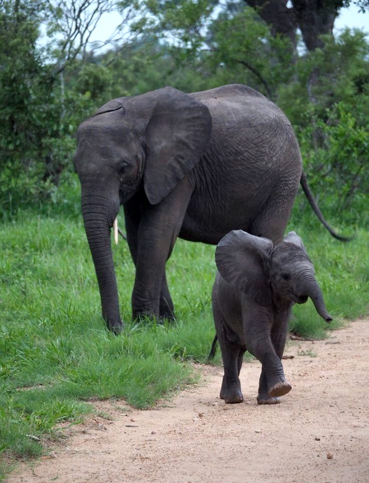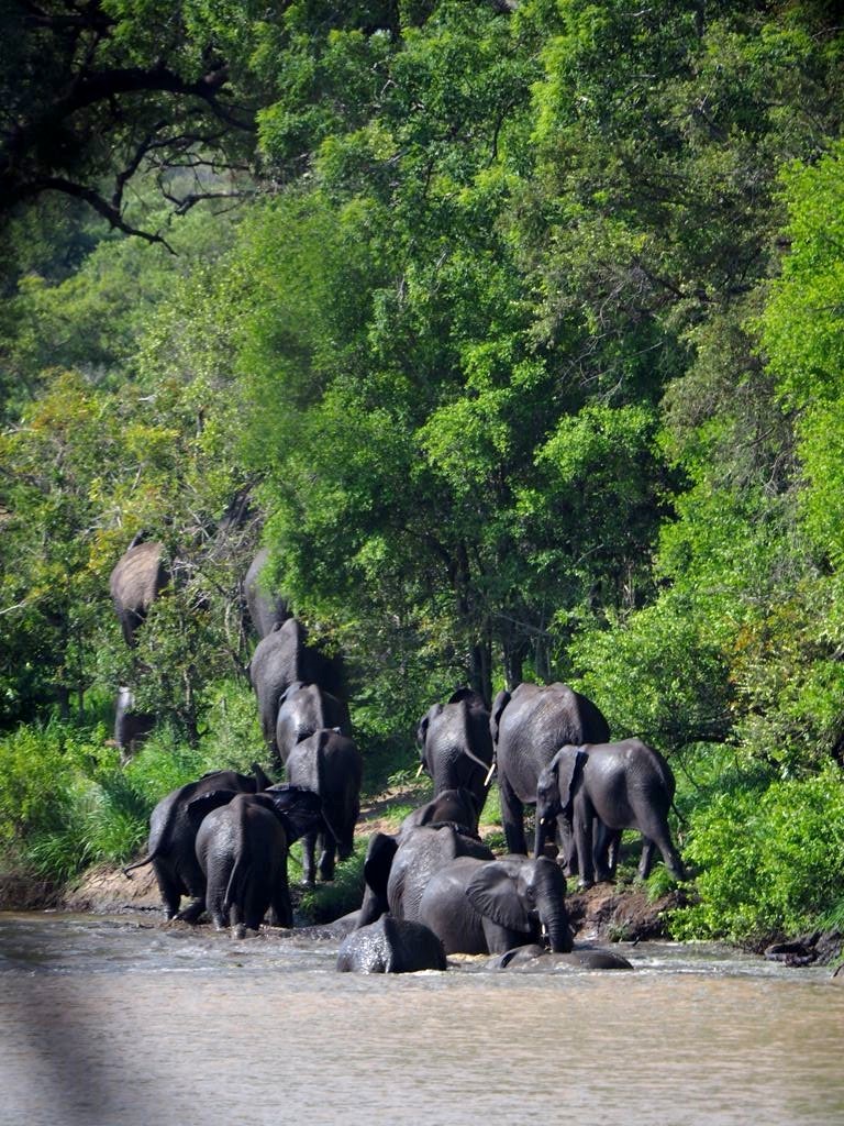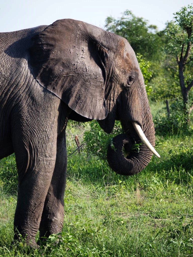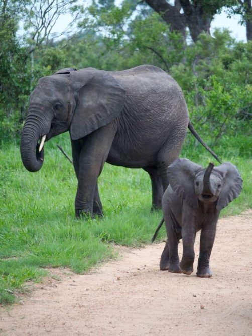Les éléphants, par contre, ne se laissaient pas trop voir. Mais là, à quelques minutes du lodge… nous tombons littéralement nez à nez avec la traversée d’une famille entière d’éléphants (famille que nous reverrons beaucoup les jours suivants puisqu’elle semble occuper la zone du Hamilton’s !). C’est tellement impressionnant de les observer : ce que notre guide allait nous expliquer un peu plus tard, c’est que les éléphants sont tellement organisés qu’ils traversent les routes dans un ordre déterminé par leur rôle dans le groupe… c’est dingue ! Il s’agit aussi de l’animal qui fait le plus de morts dans le Kruger chaque année, alors redoublez d’attention, gardez vos distances et toujours le moteur qui tourne en présence d’éléphants. Ce n’est pas Babar devant vous, mais un animal de plusieurs tonnes qui peut vouloir défendre son territoire ou sa femelle !