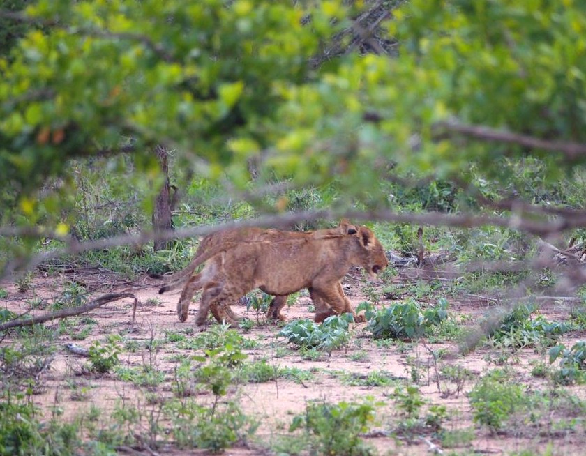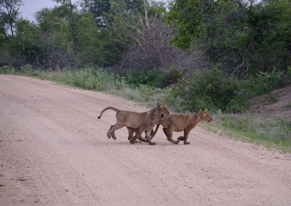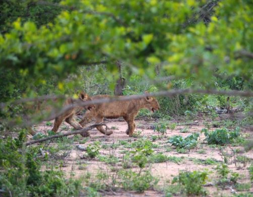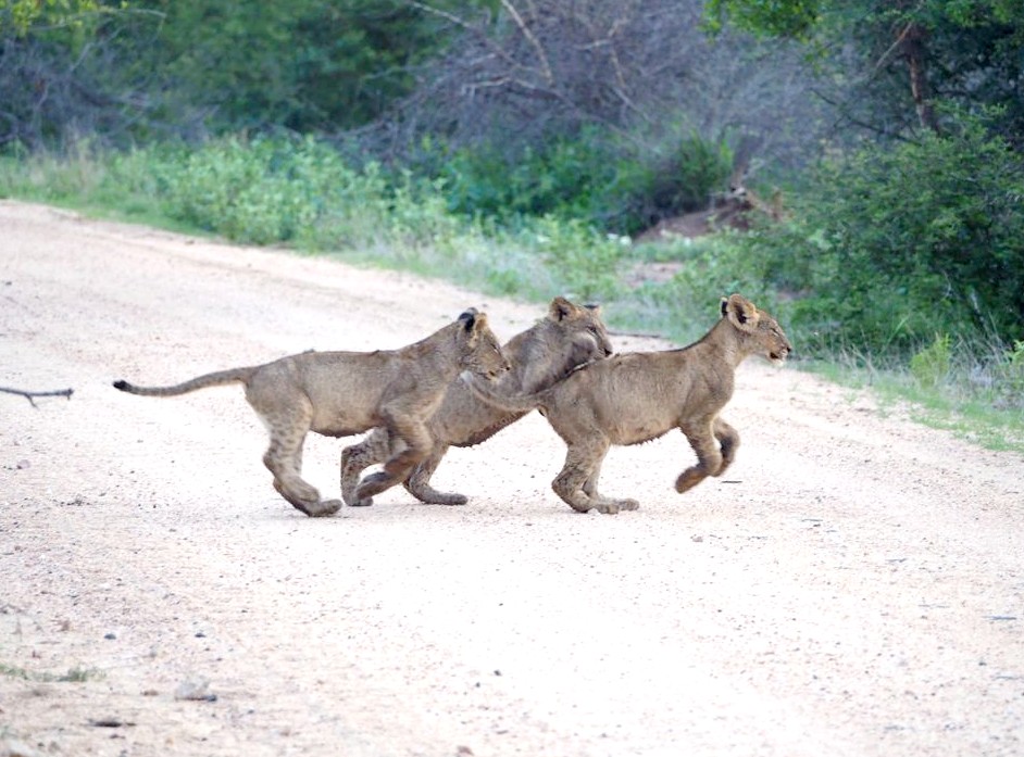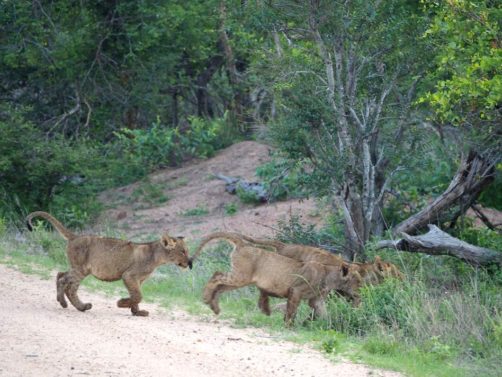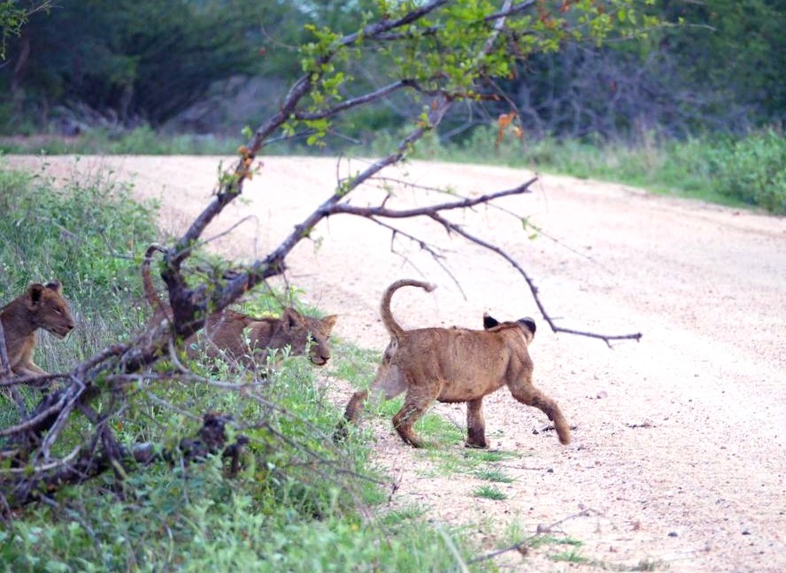 Mais les lionnes nous réservaient encore une dernière surprise avant de disparaître de notre vue : les petits retardataires… trois magnifiques petits lionceaux !!