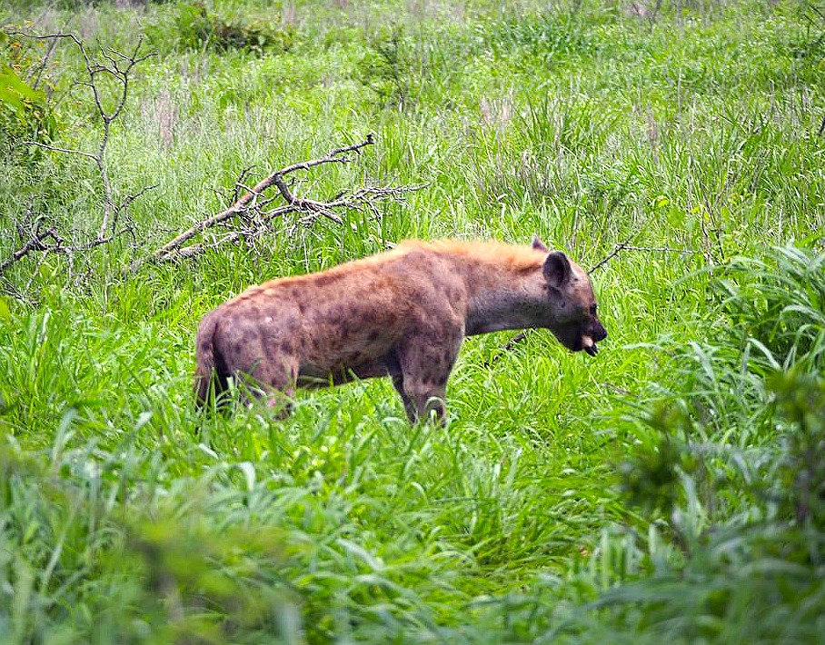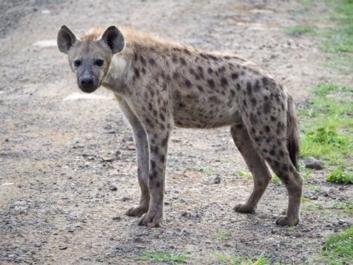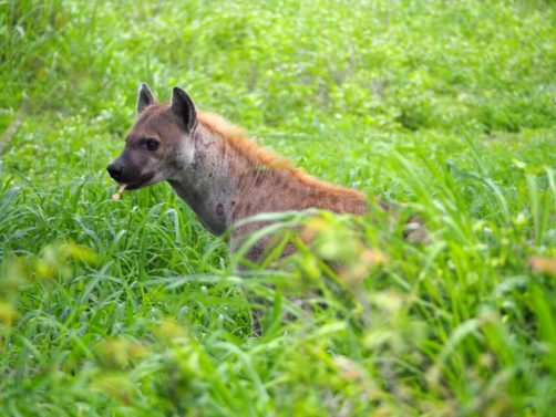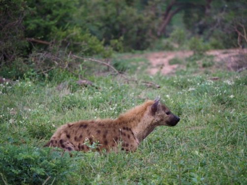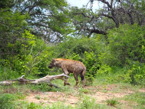 Et s’il n’a pas l’air content (on a même eu droit à des grognements), c’est à cause des hyènes qui le font chier pour essayer de récupérer son butin ! Pas tous les jours facile de défendre sa bouffe dans la savane, même quand on sait grimper dans les arbres… Importuné, il a finalement du laisser la fin de son repas dans l’arbre et finira par fuir face aux trois petits enquiquineurs.