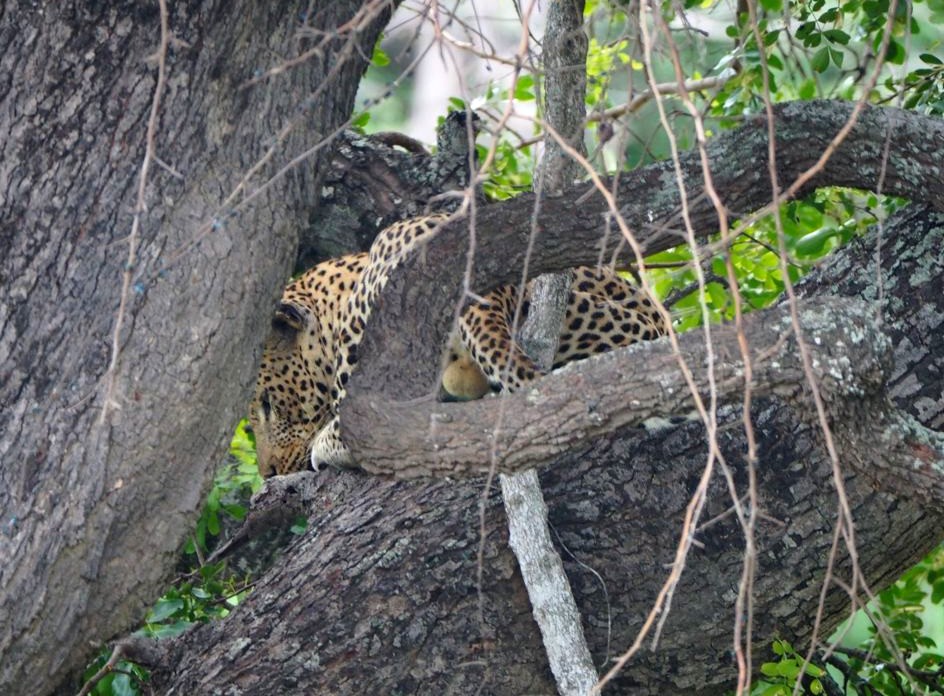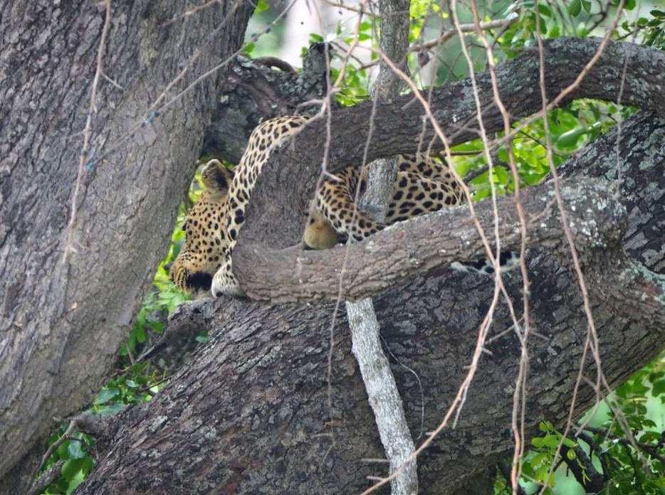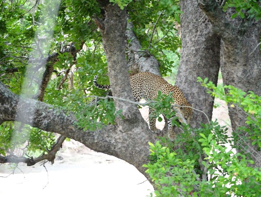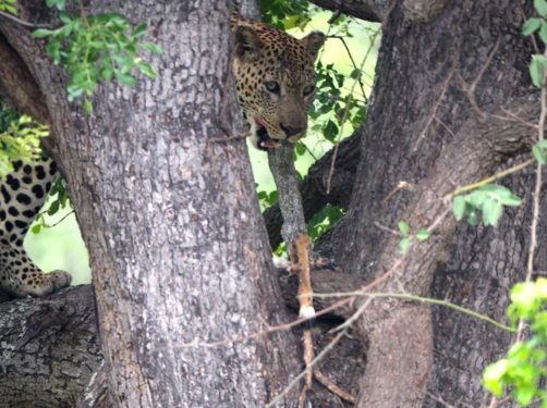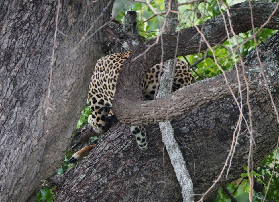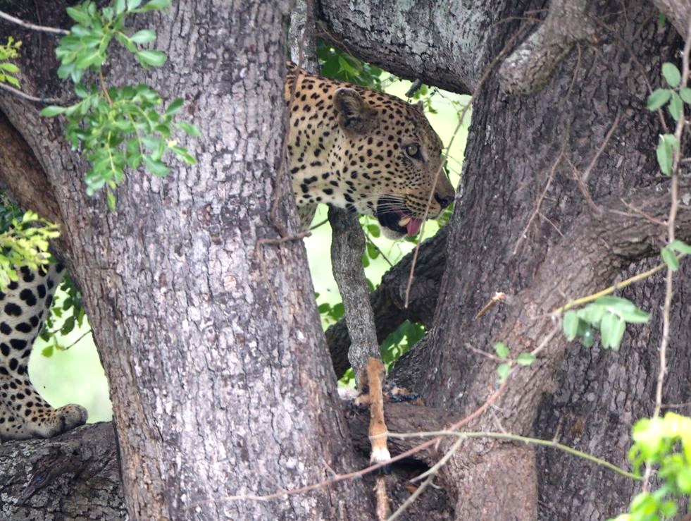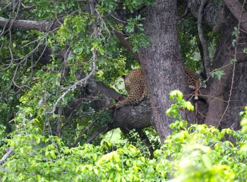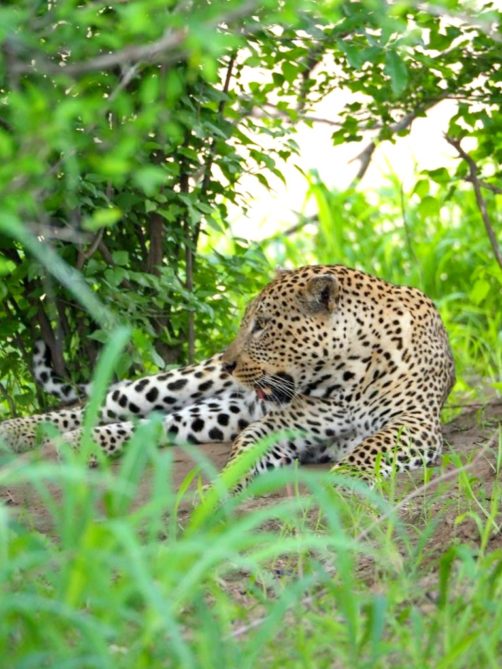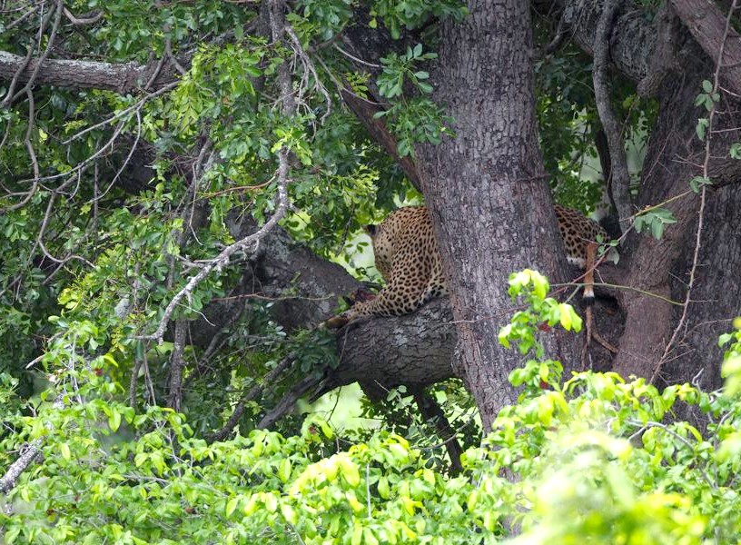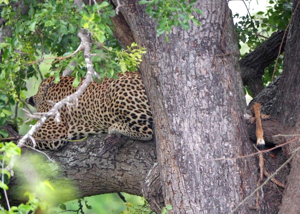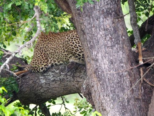 Nous reprenons la route avec comme objectif retrouver l’arbre où se trouvait la fin du festin de sa majesté le léopard. Même Themba avait peu d’espoir pour nous mais vous savez quoi ? On l’a retrouvé et le gros gourmand était toujours là en train de finir son festin de pattes d’antilopes ! Et cette fois-ci on a pu l’observer beaucoup plus longuement ! Pour moi le léopard est clairement le plus élégant de la savane. L’observer est incroyable… quel magnifique animal !