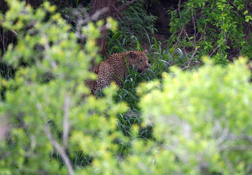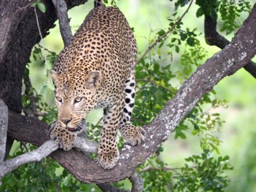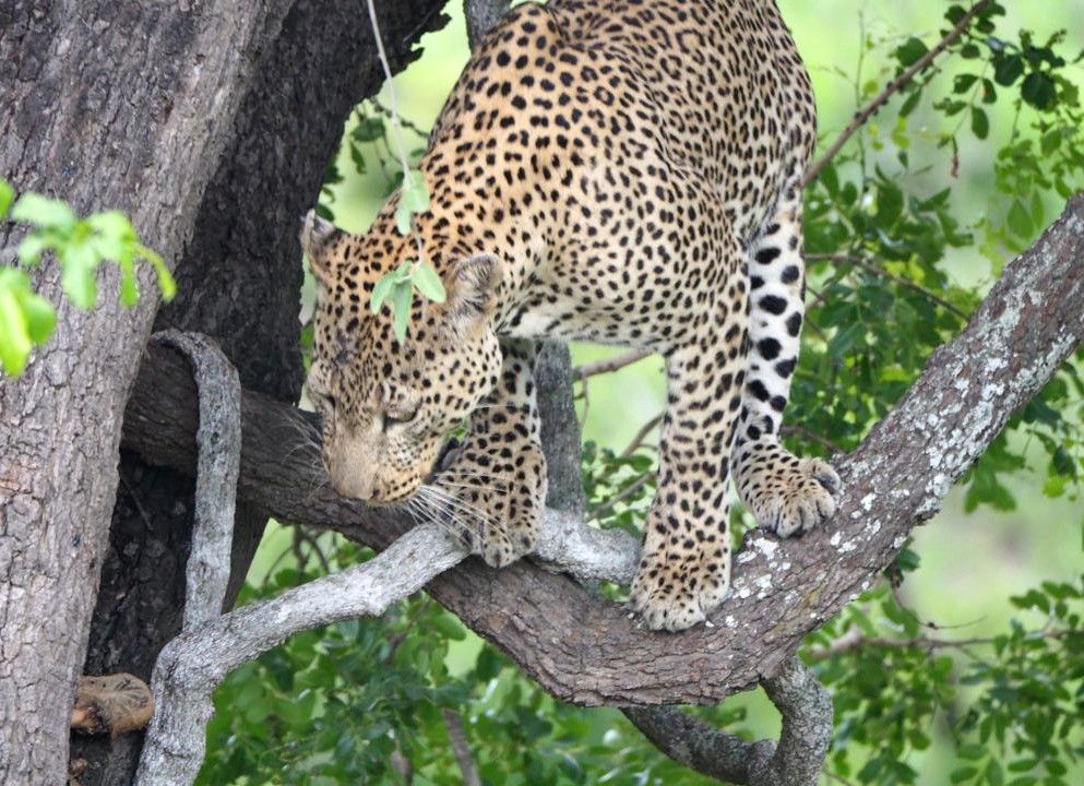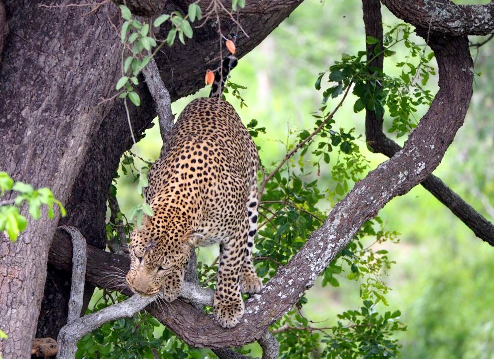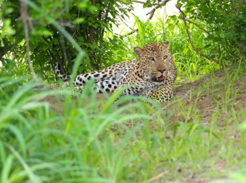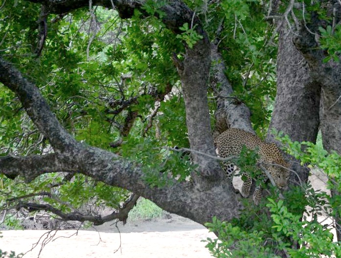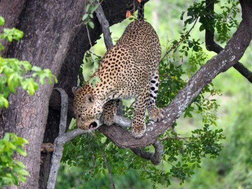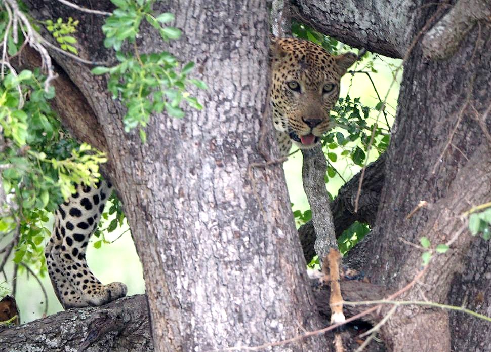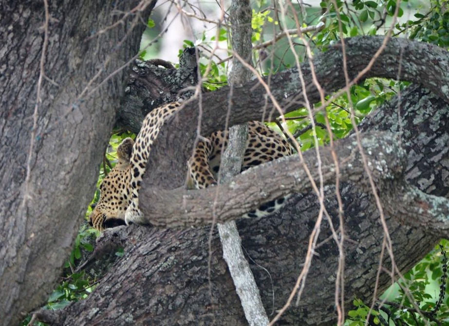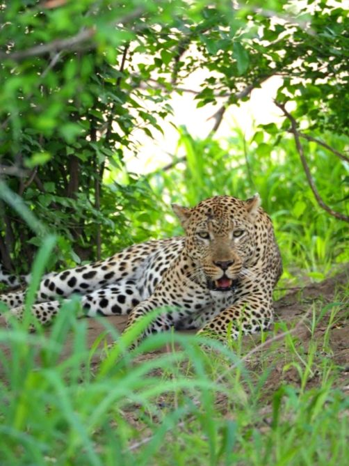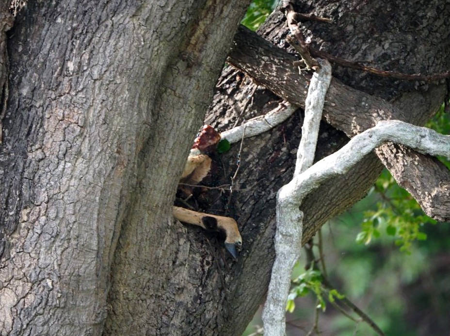Nous reprenons la route avec comme objectif retrouver l’arbre où se trouvait la fin du festin de sa majesté le léopard. Même Themba avait peu d’espoir pour nous mais vous savez quoi ? On l’a retrouvé et le gros gourmand était toujours là en train de finir son festin de pattes d’antilopes ! Et cette fois-ci on a pu l’observer beaucoup plus longuement ! Pour moi le léopard est clairement le plus élégant de la savane. L’observer est incroyable… quel magnifique animal !