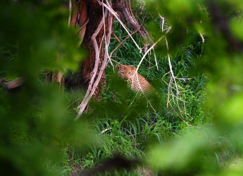 Heureusement, les jeeps de safari peuvent rouler plus vite que les voitures normales si elles sont conduites pas un ranger en service (jusqu’à 80 km/h). On a cru que ça serait trop tard mais finalement, le léopard est là ! Cette fois-ci c’est un gros mâle et on arrive juste à temps pour le voir descendre de son arbre où il était monté avec son festin !