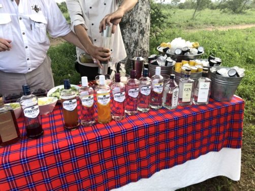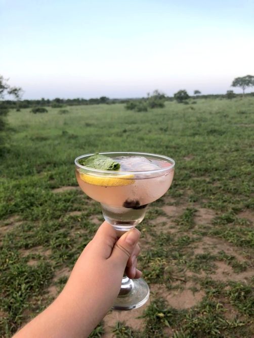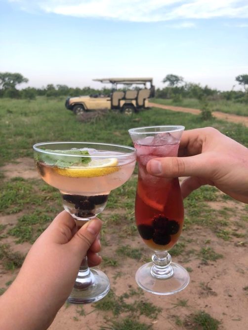 Et puis soudain… Themba nous dit de descendre de la jeep et c’est … Gin tonic party au milieu de la savane avec les autres lodges de la concession ! Il n’y a pas de meilleur endroit pour déguster du gin sud-africain au rooibos, ça c’est sur ! Les guides restaient bien à l’affût pendant que nous dégustions notre cocktail car nous étions entourés de girafes et surtout d’un éléphant solitaire (= mauvais plan chez les éléphants) qui se cachait à une centaine de mètres…