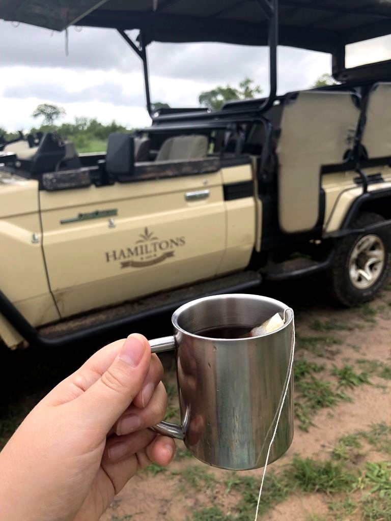 Nous retrouvons ensuite les autres clients au lodge principal pour un petit tea time (avec du thé glacé au rooibos vanillé maison pour moi, un régal !) avant de partir pour notre premier game drive. Nous faisons connaissance avec notre équipe safari pour les 2 prochains jours : deux américains en voyage de noces et notre guide Themba. Même si nous n’étions pas nombreux au lodge, nous étions divisé en plusieurs voitures pour avoir la meilleure expérience possible, c’est aussi un petit plus des lodges de luxe par rapports aux voitures pleines à craquer ailleurs.