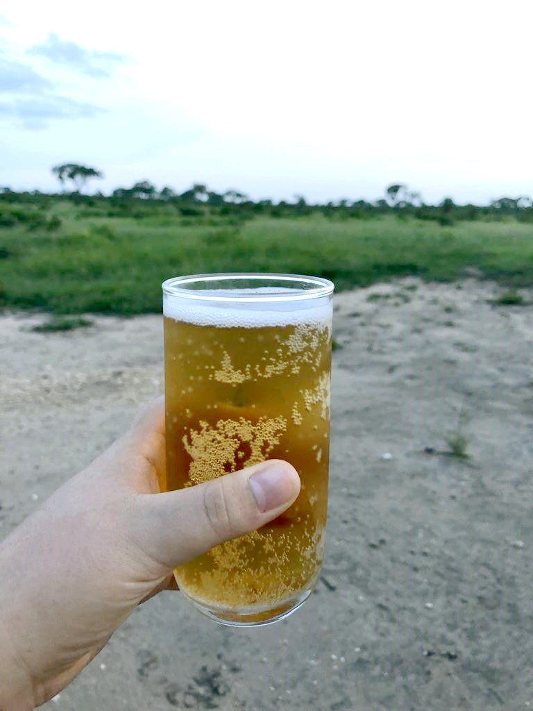 En fin d’après-midi, on est reparti pour le second game drive du jour. Et on a vu nos premières autruches ! Ce safari était un peu moins palpitant (éléphants, girafes, vautours,…) car il faisait vraiment trop chaud pour les animaux. Et pas de gin tonic party aujourd’hui (ils ne le font qu’un jour sur deux en haute saison) mais une petite bière bien fraîche au milieu de la savane tout de même.