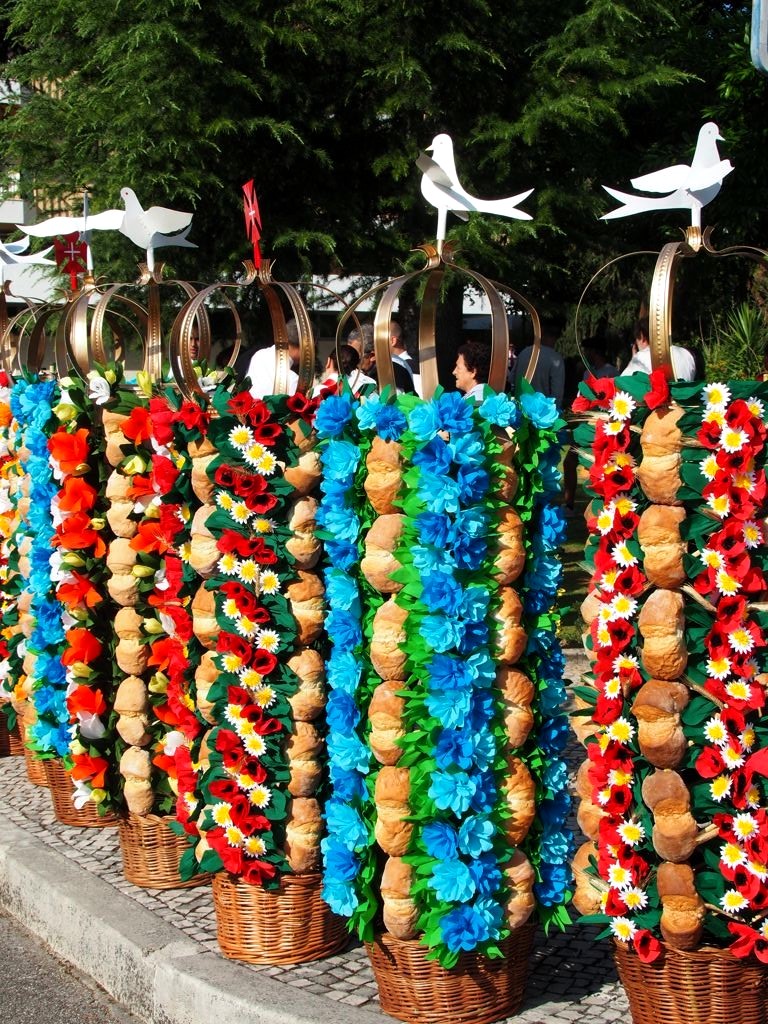 Les tabuleiros sont tous décorés avec des décorations en papier (souvent en forme de fleurs ou de plantes) et avec 30 petits pains (« trigos ») qui seront offerts aux plus démunis (avec également de la viande et du vin) à la fin du festival. Le tout est accroché à un panier en osier et est surmonté par une colombe symbole du Saint-Esprit ou par une croix chrétienne.