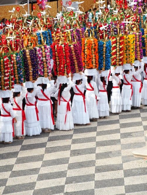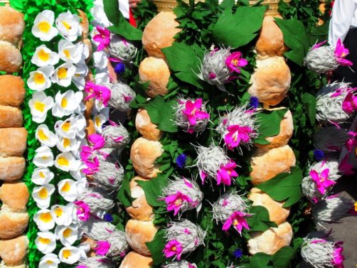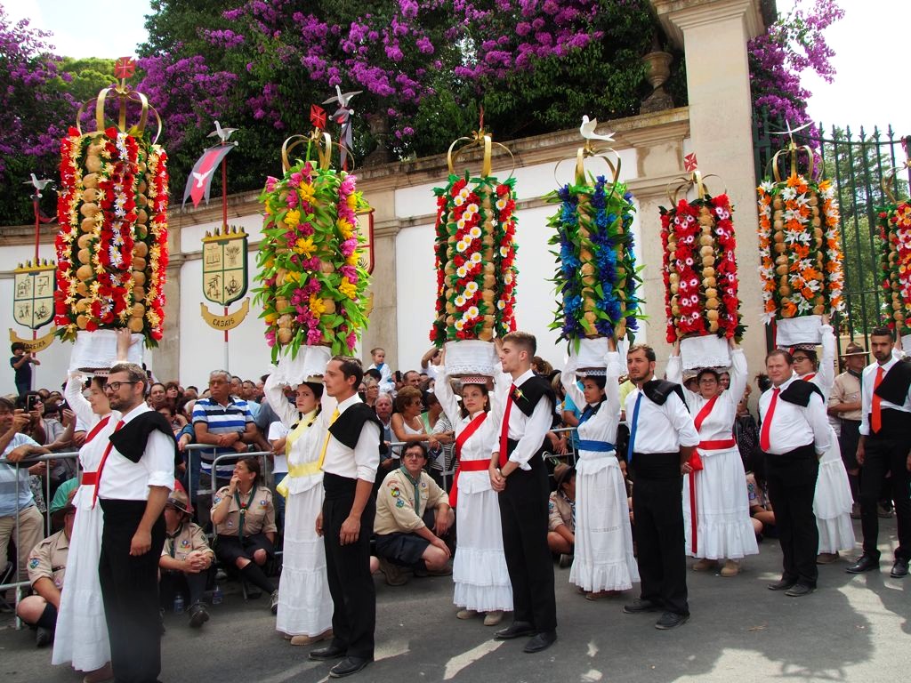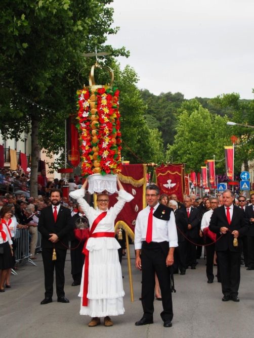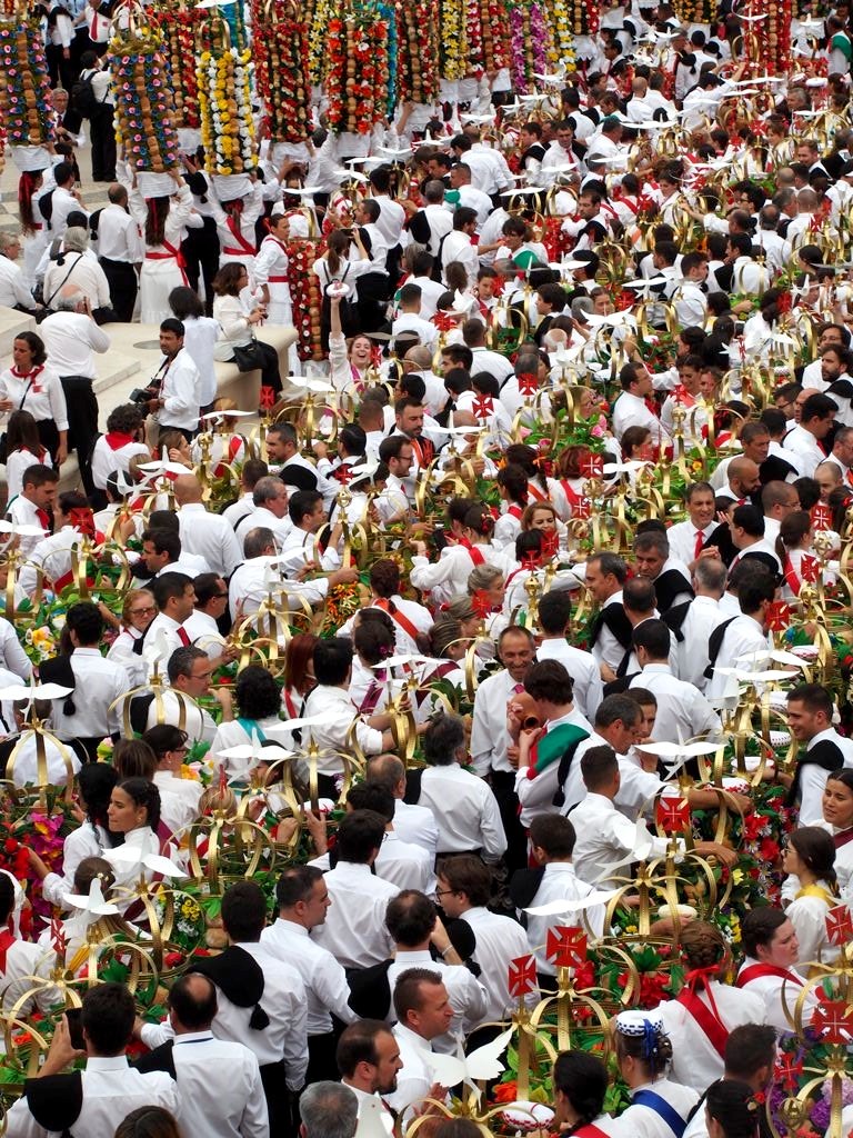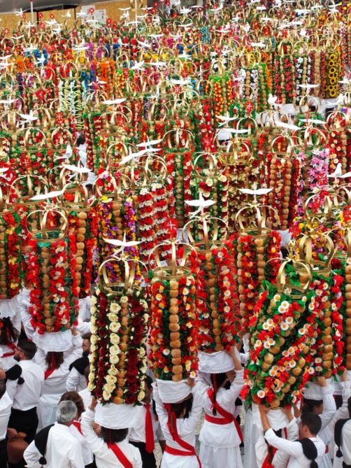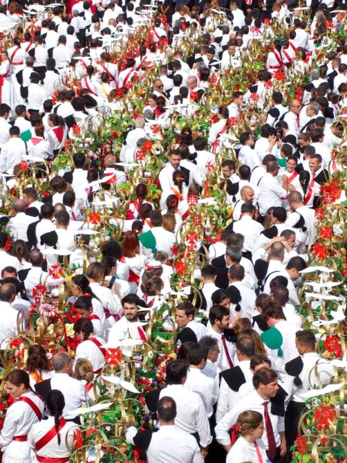 Une fois arrivés sur la place, tous les porteurs de tabuleiros se rassemblent en son centre. Pour observer le spectacle, nous avons pu monter (un autre privilège) au sommet de l’hôtel de ville, face à l’Eglise Saint-Jean-Baptiste. C’était vraiment impressionnant. Les femmes déposent leur tabuleiro au sol pour la messe, durant laquelle les tabuleiros seront bénis. A la fin de la messe, la cloche de l’église sonne trois coups. Au troisième coup, dans un silence absolu, tous les tabuleiros se redressent d’un même mouvement. Quel moment, j’en ai encore des frissons !