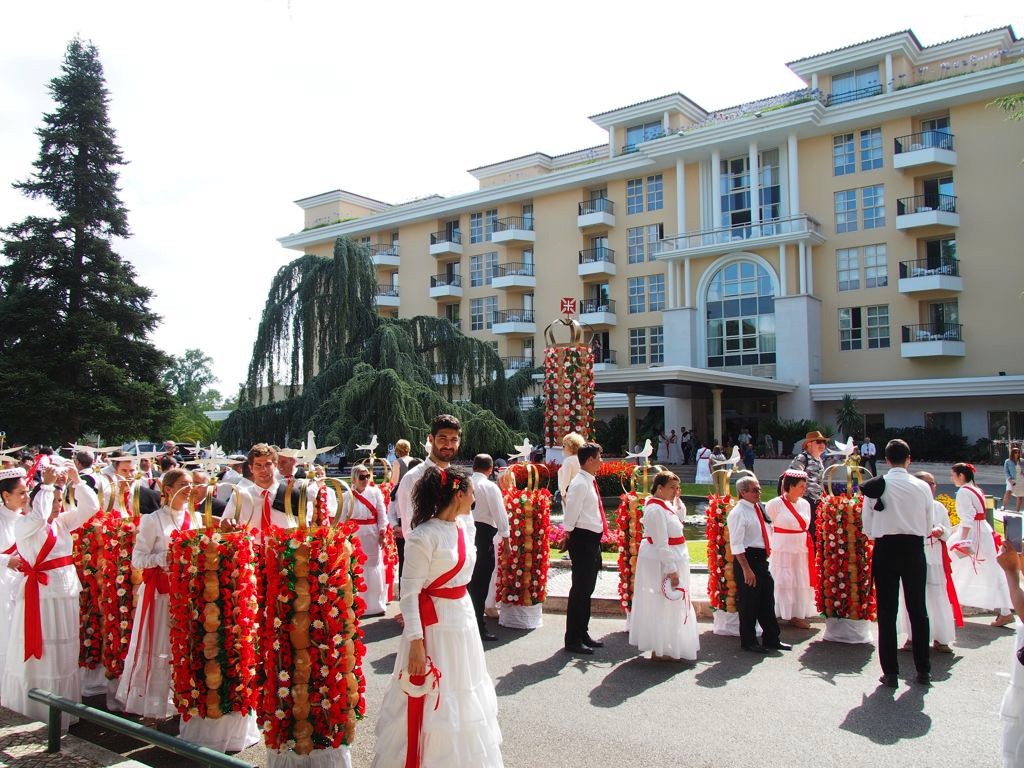 Le samedi matin, les Tabuleiros se rassemblent par paroisse (un des points de rendez-vous se trouvait justement à notre hôtel !) avant de se rejoindre dans le centre de Tomar. Les groupes passent un à un devant l’Hôtel de Ville puis les tabuleiros sont déposés jusqu’au lendemain à la « forêt nationale des 7 collines », le parc où ils seront exposés jusqu’à la parade finale du lendemain.